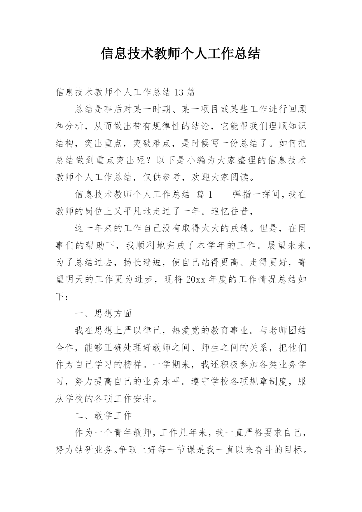 信息技术教师个人工作总结信息技术教师个人工作总结13篇总结是事后对某一时期、某一项目或某些工作进行回顾和分析,从而做出带有规律性的结论,它能帮我们理顺知识结构,突出重点,突破难点,是时候写一份总结了。如何把总结做到重点突出呢?以下是小编为大家整理的信息技术教师个人工作总结,仅供参考,欢迎大家阅读。信息技术教师个人工作总结篇1弹指一挥间,我在教师的岗位上又平凡地走过了一年。追忆往昔,这一年来的工作自己没有取得太大的成绩。但是,在同事们的帮助下,我顺利地完成了本学年的工作。展望未来,为了总结过去,扬长避短,使