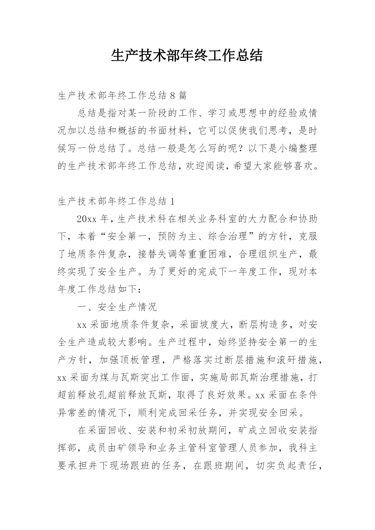 生产技术部年终工作总结生产技术部年终工作总结8篇总结是指对某一阶段的工作、学习或思想中的经验或情况加以总结和概括的书面材料,它可以促使我们思考,是时候写一份总结了。总结一般是怎么写的呢?以下是小编整理的生产技术部年终工作总结,欢迎阅读,希望大家能够喜欢。生产技术部年终工作总结120xx年,生产技术科在相关业务科室的大力配合和协助下,本着“安全第一,预防为主、综合治理”的方针,克服了地质条件复杂,接替失调等重重困难,合理组织生产,最终实现了安全生产。为了更好的完成下一年度工作,现对本年度工作总结如下:一、安