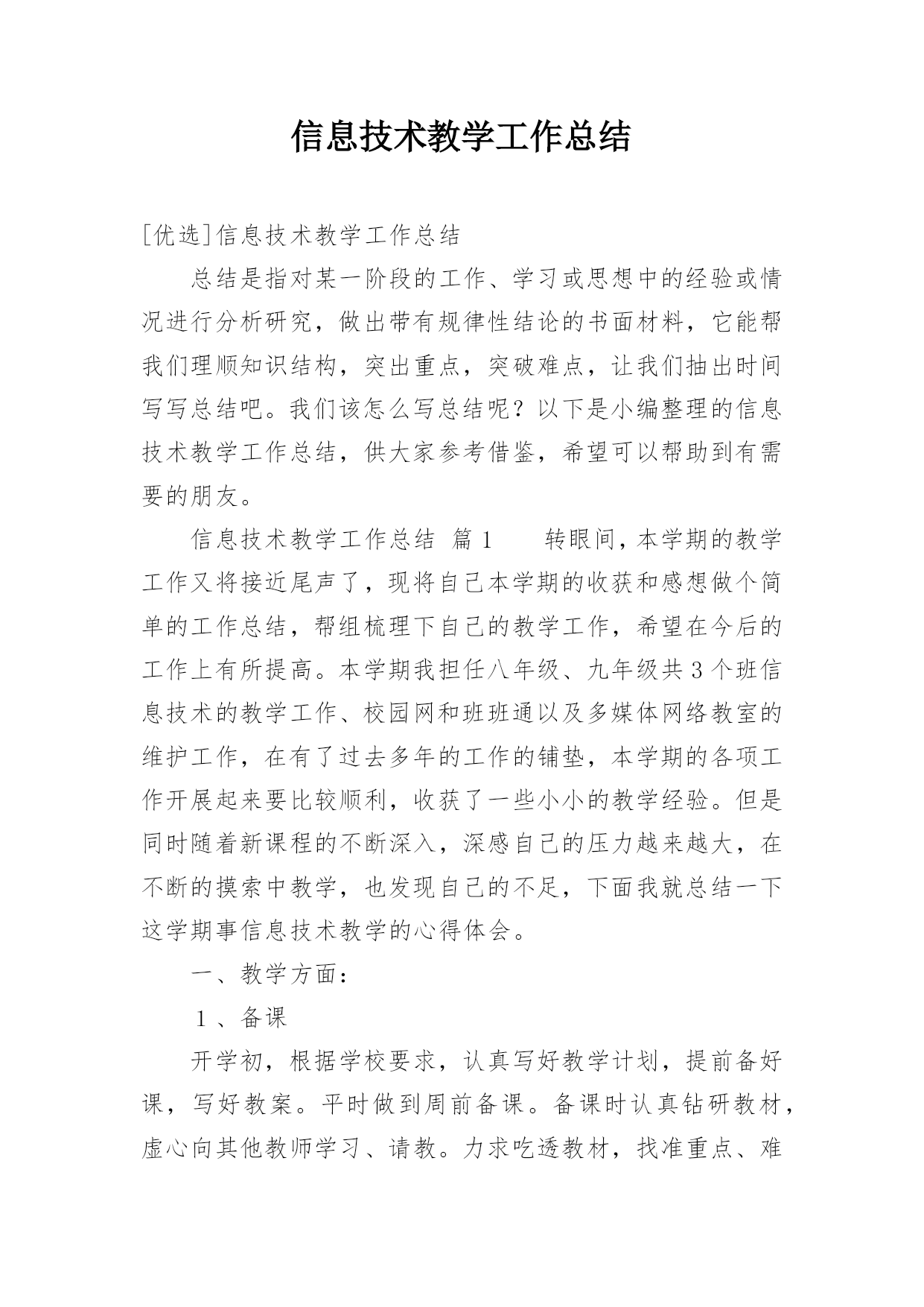 信息技术教学工作总结[优选]信息技术教学工作总结总结是指对某一阶段的工作、学习或思想中的经验或情况进行分析研究,做出带有规律性结论的书面材料,它能帮我们理顺知识结构,突出重点,突破难点,让我们抽出时间写写总结吧。我们该怎么写总结呢?以下是小编整理的信息技术教学工作总结,供大家参考借鉴,希望可以帮助到有需要的朋友。信息技术教学工作总结篇1转眼间,本学期的教学工作又将接近尾声了,现将自己本学期的收获和感想做个简单的工作总结,帮组梳理下自己的教学工作,希望在今后的工作上有所提高。本学期我担任八年级、九年级共3个