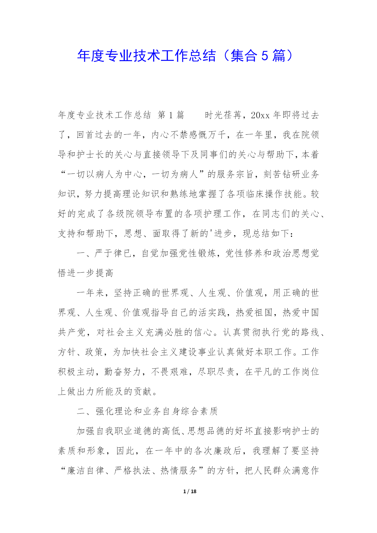 PAGE18/NUMPAGES18年度专业技术工作总结(集合5篇)年度专业技术工作总结第1篇时光荏苒,20xx年即将过去了,回首过去的一年,内心不禁感慨万千,在一年里,我在院领导和护士长的关心与直接领导下及同事们的关心与帮助下,本着“一切以病人为中心,一切为病人”的服务宗旨,刻苦钻研业务知识,努力提高理论知识和熟练地掌握了各项临床操作技能。较好的完成了各级院领导布置的各项护理工作,在同志们的关心、支持和帮助下,思想、面取得了新的'进步,现总结如下:一、严于律已,自觉加强党性锻炼,党性修养和政治