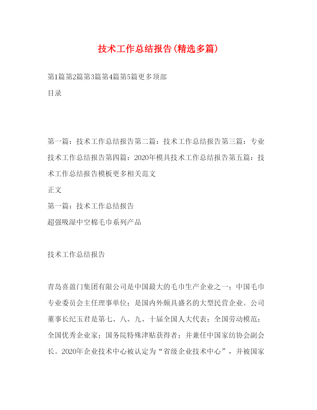 PAGE此资料由网络收集而来,如有侵权请告知上传者立即删除。资料共分享,我们负责传递知识。技术工作总结报告(精选多篇)第1篇第2篇第3篇第4篇第5篇更多顶部目录第一篇:技术工作总结报告第二篇:技术工作总结报告第三篇:专业技术工作总结报告第四篇:2020年模具技术工作总结报告第五篇:技术工作总结报告模板更多相关范文正文第一篇:技术工作总结报告超强吸湿中空棉毛巾系列产品技术工作总结报告青岛喜盈门集团有限公司是中国最大的毛巾生产企业之一;中国毛巾专业委员会主任理事单位;是国内外颇具盛名的大型民营企业。公司