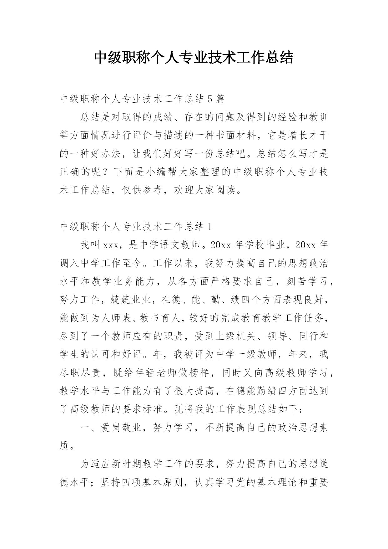 中级职称个人专业技术工作总结中级职称个人专业技术工作总结5篇总结是对取得的成绩、存在的问题及得到的经验和教训等方面情况进行评价与描述的一种书面材料,它是增长才干的一种好办法,让我们好好写一份总结吧。总结怎么写才是正确的呢?下面是小编帮大家整理的中级职称个人专业技术工作总结,仅供参考,欢迎大家阅读。中级职称个人专业技术工作总结1我叫xxx,是中学语文教师。20xx年学校毕业,20xx年调入中学工作至今。工作以来,我努力提高自己的思想政治水平和教学业务能力,从各方面严格要求自己,刻苦学习,努力工作,兢兢业业,