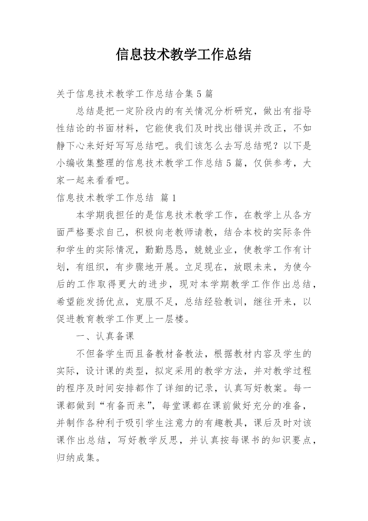 信息技术教学工作总结关于信息技术教学工作总结合集5篇总结是把一定阶段内的有关情况分析研究,做出有指导性结论的书面材料,它能使我们及时找出错误并改正,不如静下心来好好写写总结吧。我们该怎么去写总结呢?以下是小编收集整理的信息技术教学工作总结5篇,仅供参考,大家一起来看看吧。信息技术教学工作总结篇1本学期我担任的是信息技术教学工作,在教学上从各方面严格要求自己,积极向老教师请教,结合本校的实际条件和学生的实际情况,勤勤恳恳,兢兢业业,使教学工作有计划,有组织,有步骤地开展。立足现在,放眼未来,为使今后的工作取