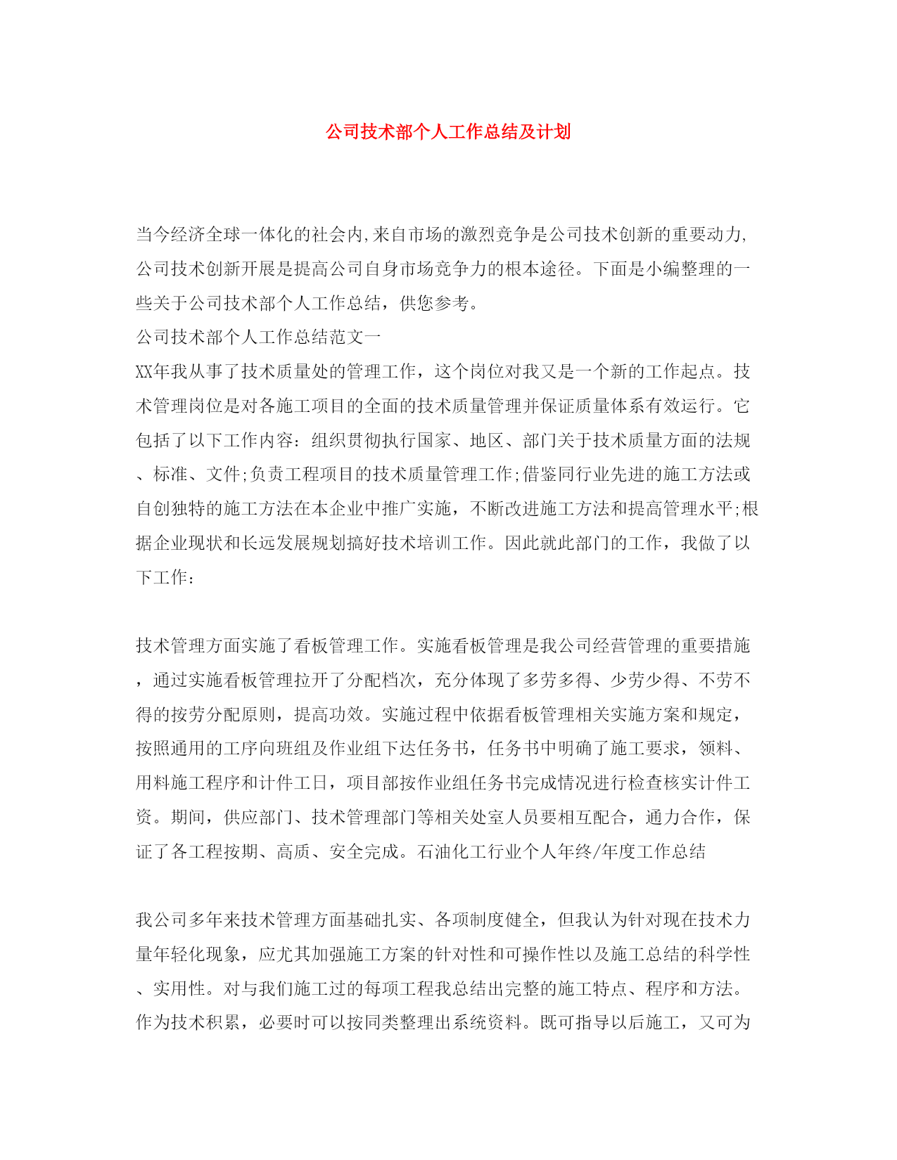 此资料由网络收集而来,如有侵权请告知上传者立即删除。资料共分享,我们负责传递知识。公司技术部个人工作总结及计划当今经济全球一体化的社会内,来自市场的激烈竞争是公司技术创新的重要动力,公司技术创新开展是提高公司自身市场竞争力的根本途径。下面是小编整理的一些关于公司技术部个人工作总结,供您参考。公司技术部个人工作总结范文一XX年我从事了技术质量处的管理工作,这个岗位对我又是一个新的工作起点。技术管理岗位是对各施工项目的全面的技术质量管理并保证质量体系有效运行。它包括了以下工作内容:组织贯彻执行国家、地区、部门