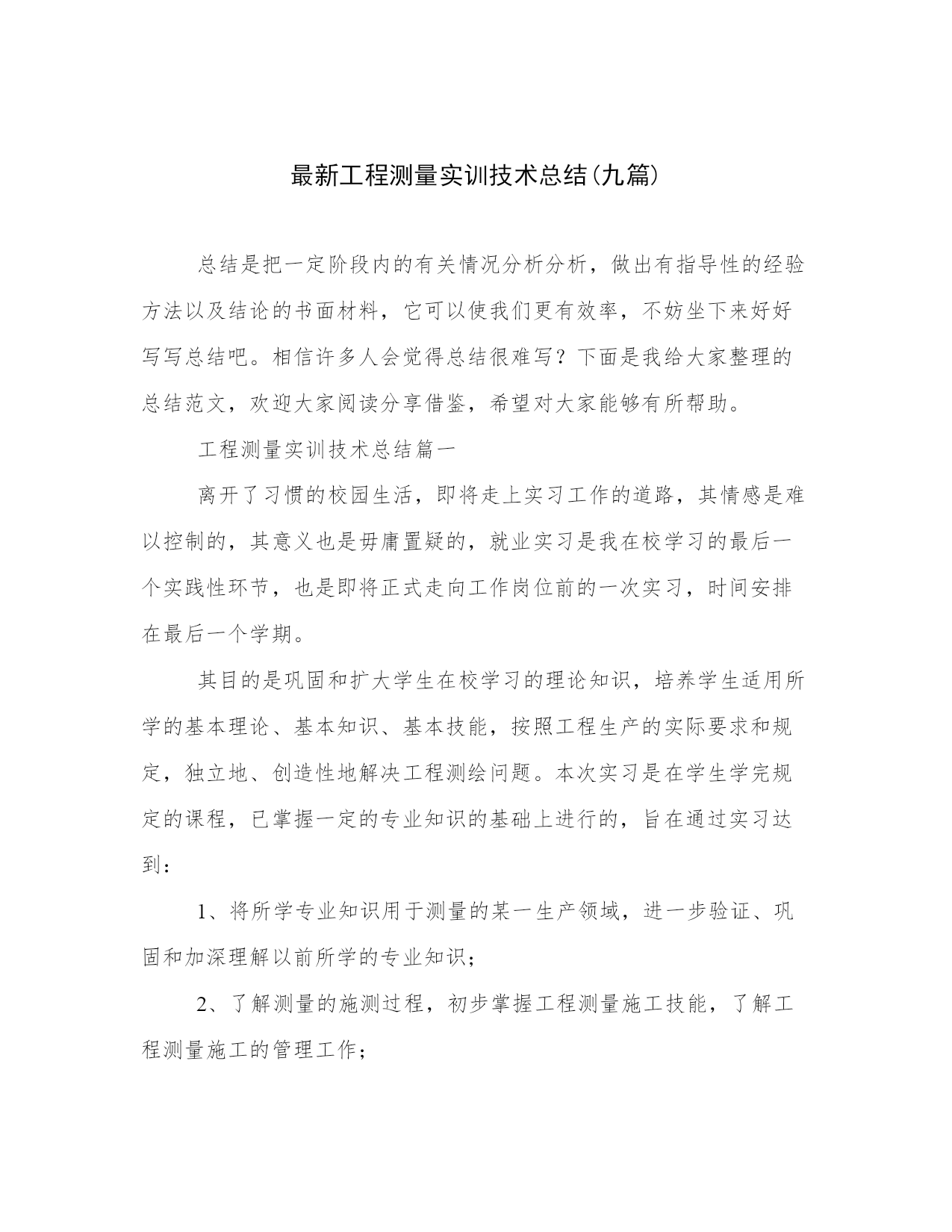 最新工程测量实训技术总结(九篇)总结是把一定阶段内的有关情况分析分析,做出有指导性的经验方法以及结论的书面材料,它可以使我们更有效率,不妨坐下来好好写写总结吧。相信许多人会觉得总结很难写?下面是我给大家整理的总结范文,欢迎大家阅读分享借鉴,希望对大家能够有所帮助。工程测量实训技术总结篇一离开了习惯的校园生活,即将走上实习工作的道路,其情感是难以控制的,其意义也是毋庸置疑的,就业实习是我在校学习的最后一个实践性环节,也是即将正式走向工作岗位前的一次实习,时间安排在最后一个学期。其目的是巩固和扩大学生在校学习