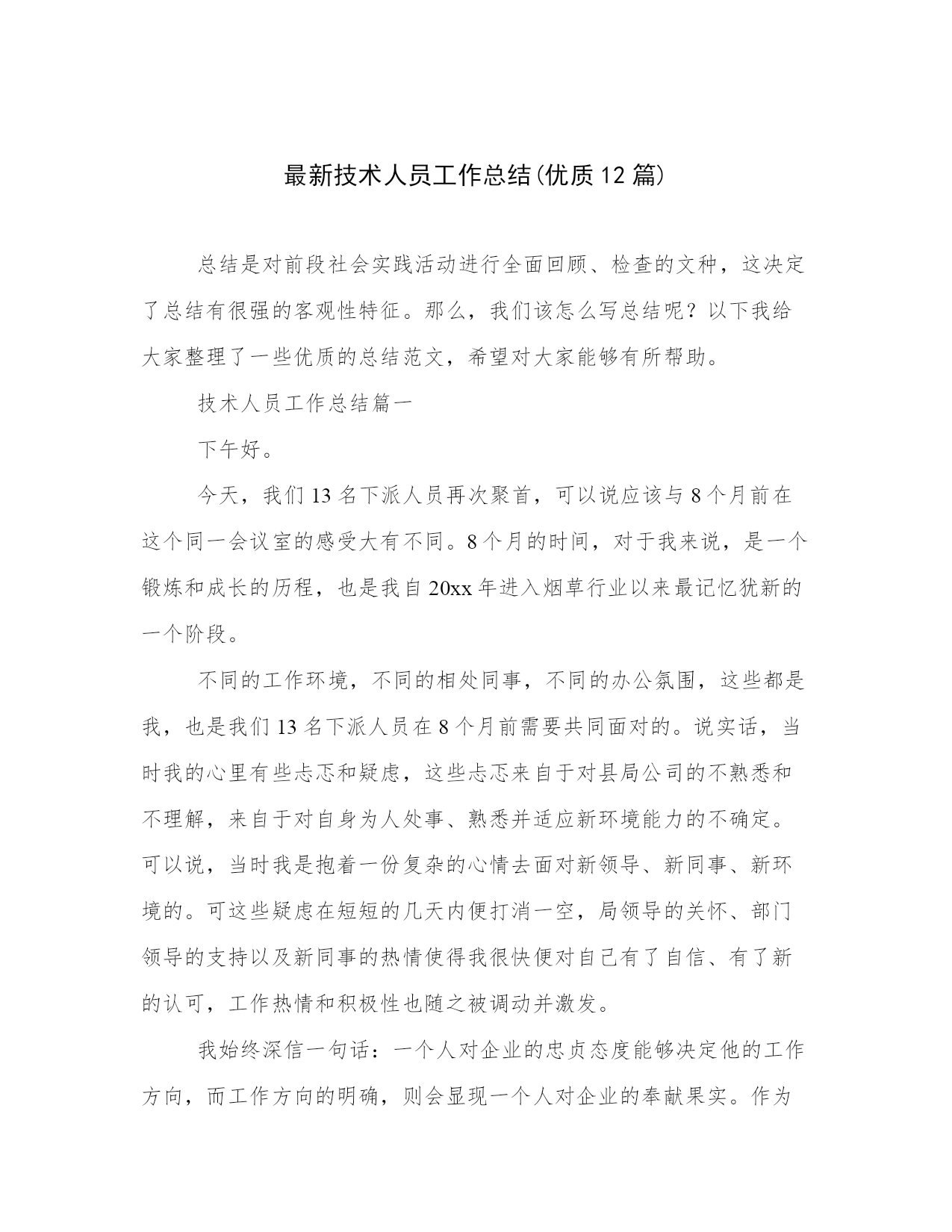 最新技术人员工作总结(优质12篇)总结是对前段社会实践活动进行全面回顾、检查的文种,这决定了总结有很强的客观性特征。那么,我们该怎么写总结呢?以下我给大家整理了一些优质的总结范文,希望对大家能够有所帮助。技术人员工作总结篇一下午好。今天,我们13名下派人员再次聚首,可以说应该与8个月前在这个同一会议室的感受大有不同。8个月的时间,对于我来说,是一个锻炼和成长的历程,也是我自20xx年进入烟草行业以来最记忆犹新的一个阶段。不同的工作环境,不同的相处同事,不同的办公氛围,这些都是我,也是我们13名下派人员在8