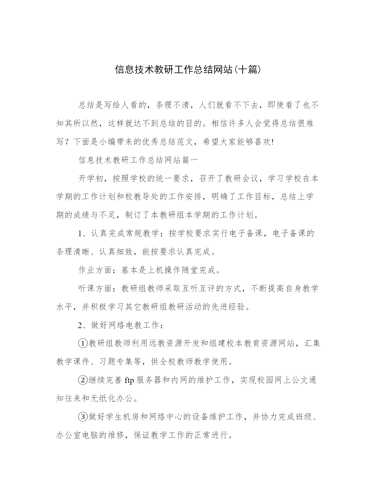 信息技术教研工作总结网站(十篇)总结是写给人看的,条理不清,人们就看不下去,即使看了也不知其所以然,这样就达不到总结的目的。相信许多人会觉得总结很难写?下面是小编带来的优秀总结范文,希望大家能够喜欢!信息技术教研工作总结网站篇一开学初,按照学校的统一要求,召开了教研会议,学习学校在本学期的工作计划和校教导处的工作安排,明确了工作目标,总结上学期的成绩与不足,制订了本教研组本学期的工作计划。1、认真完成常规教学:按学校要求实行电子备课,电子备课的条理清晰、认真细致,能按要求认真完成。作业方面:基本是上机操作