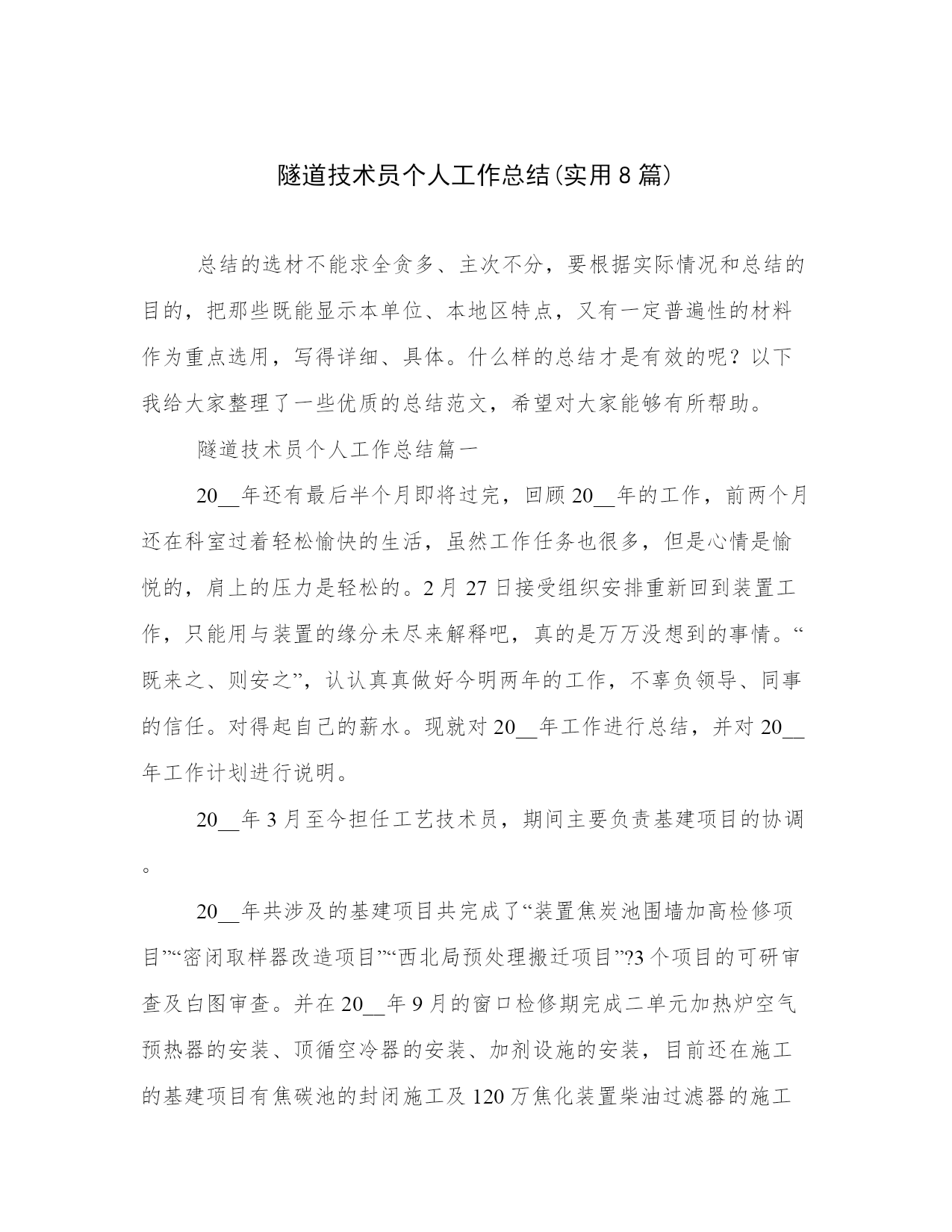 隧道技术员个人工作总结(实用8篇)总结的选材不能求全贪多、主次不分,要根据实际情况和总结的目的,把那些既能显示本单位、本地区特点,又有一定普遍性的材料作为重点选用,写得详细、具体。什么样的总结才是有效的呢?以下我给大家整理了一些优质的总结范文,希望对大家能够有所帮助。隧道技术员个人工作总结篇一20__年还有最后半个月即将过完,回顾20__年的工作,前两个月还在科室过着轻松愉快的生活,虽然工作任务也很多,但是心情是愉悦的,肩上的压力是轻松的。2月27日接受组织安排重新回到装置工作,只能用与装置的缘分未尽来解
