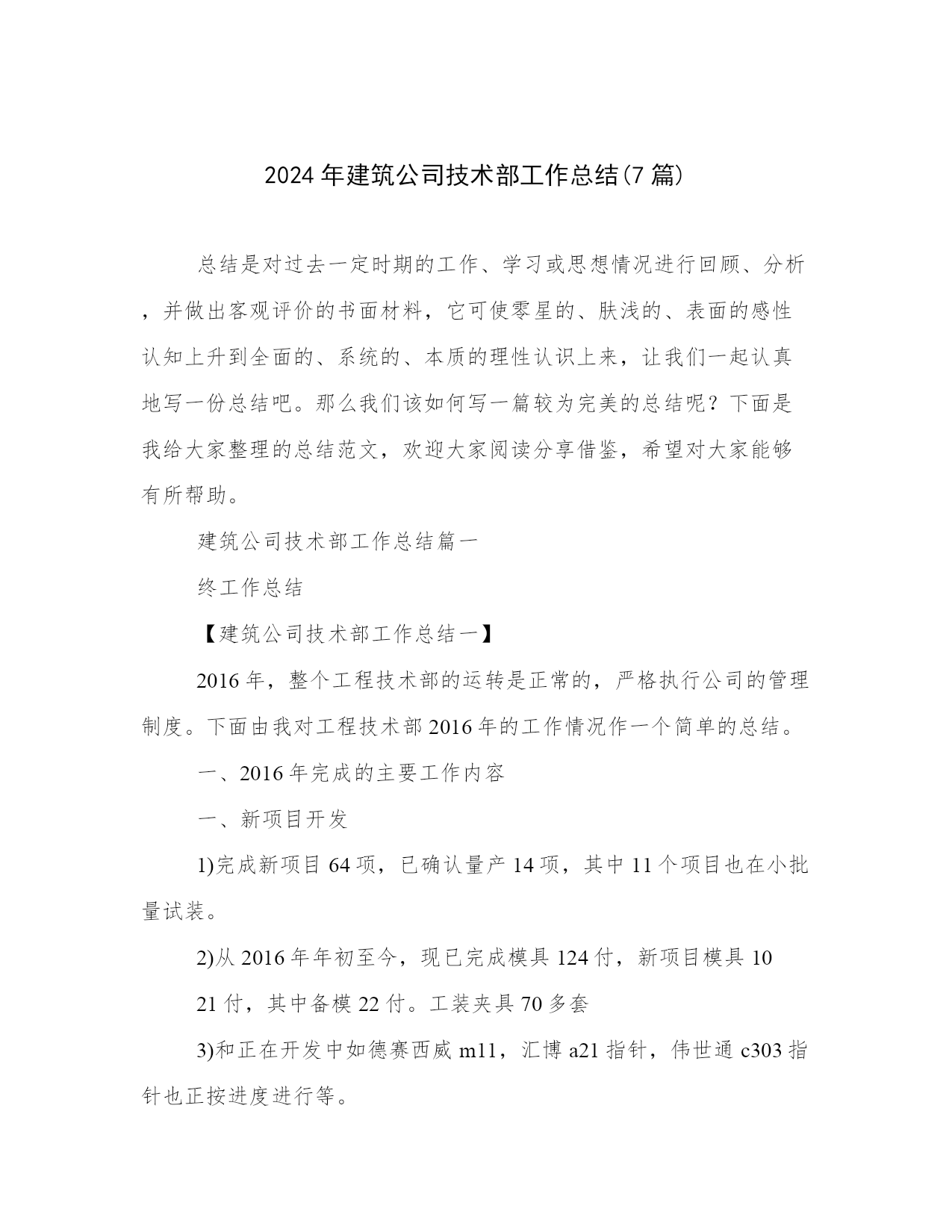 2024年建筑公司技术部工作总结(7篇)总结是对过去一定时期的工作、学习或思想情况进行回顾、分析,并做出客观评价的书面材料,它可使零星的、肤浅的、表面的感性认知上升到全面的、系统的、本质的理性认识上来,让我们一起认真地写一份总结吧。那么我们该如何写一篇较为完美的总结呢?下面是我给大家整理的总结范文,欢迎大家阅读分享借鉴,希望对大家能够有所帮助。建筑公司技术部工作总结篇一终工作总结【建筑公司技术部工作总结一】2016年,整个工程技术部的运转是正常的,严格执行公司的管理制度。下面由我对工程技术部2016年的工