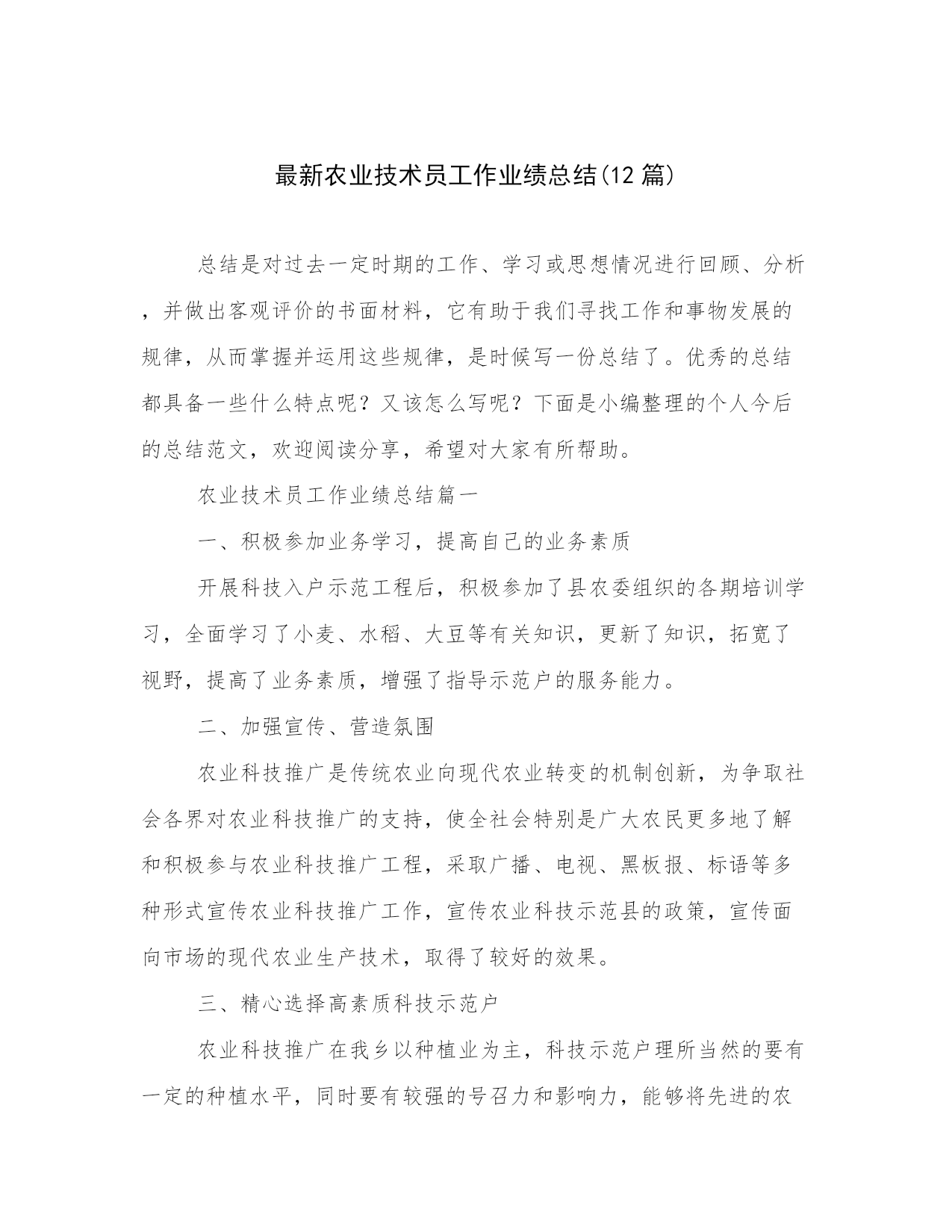 最新农业技术员工作业绩总结(12篇)总结是对过去一定时期的工作、学习或思想情况进行回顾、分析,并做出客观评价的书面材料,它有助于我们寻找工作和事物发展的规律,从而掌握并运用这些规律,是时候写一份总结了。优秀的总结都具备一些什么特点呢?又该怎么写呢?下面是小编整理的个人今后的总结范文,欢迎阅读分享,希望对大家有所帮助。农业技术员工作业绩总结篇一一、积极参加业务学习,提高自己的业务素质开展科技入户示范工程后,积极参加了县农委组织的各期培训学习,全面学习了小麦、水稻、大豆等有关知识,更新了知识,拓宽了视野,提高