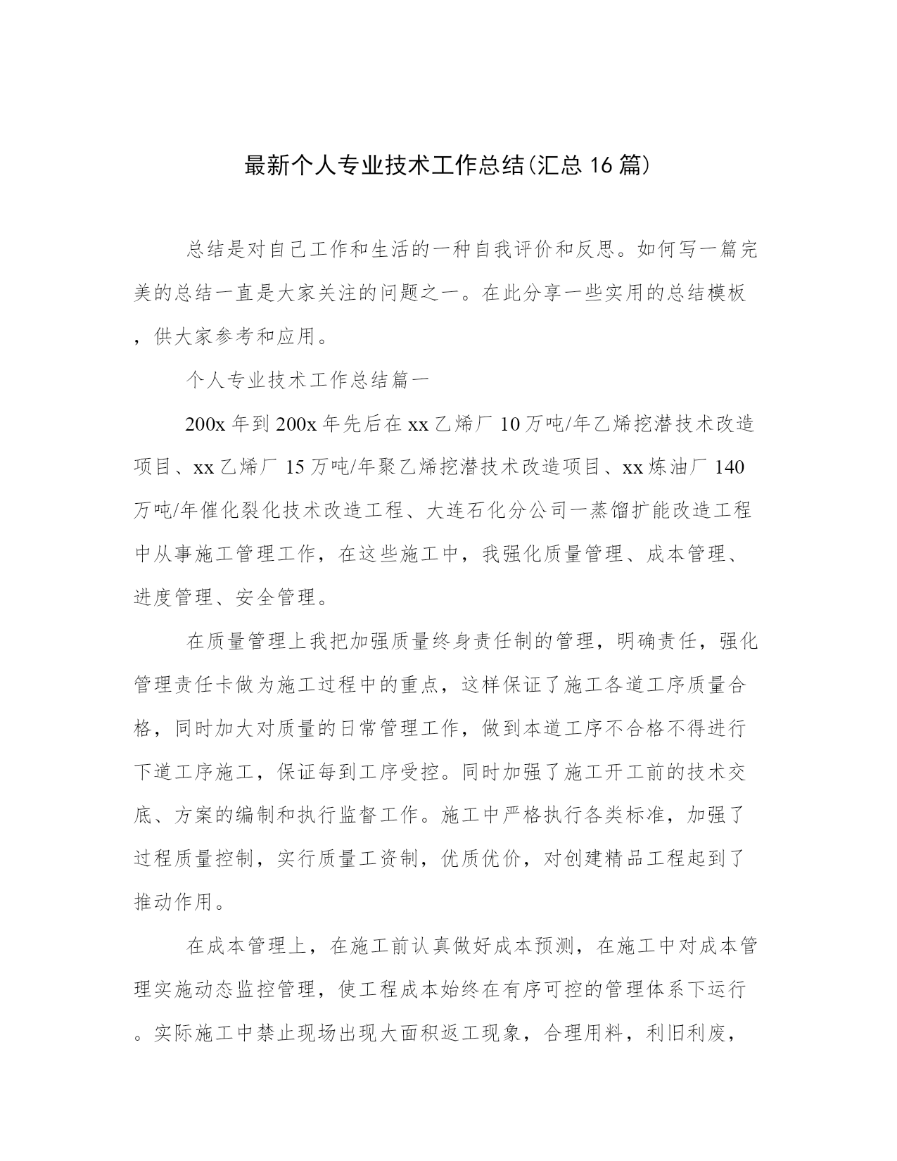 最新个人专业技术工作总结(汇总16篇)总结是对自己工作和生活的一种自我评价和反思。如何写一篇完美的总结一直是大家关注的问题之一。在此分享一些实用的总结模板,供大家参考和应用。个人专业技术工作总结篇一200x年到200x年先后在xx乙烯厂10万吨/年乙烯挖潜技术改造项目、xx乙烯厂15万吨/年聚乙烯挖潜技术改造项目、xx炼油厂140万吨/年催化裂化技术改造工程、大连石化分公司一蒸馏扩能改造工程中从事施工管理工作,在这些施工中,我强化质量管理、成本管理、进度管理、安全管理。在质量管理上我把加强质量终身责任制的