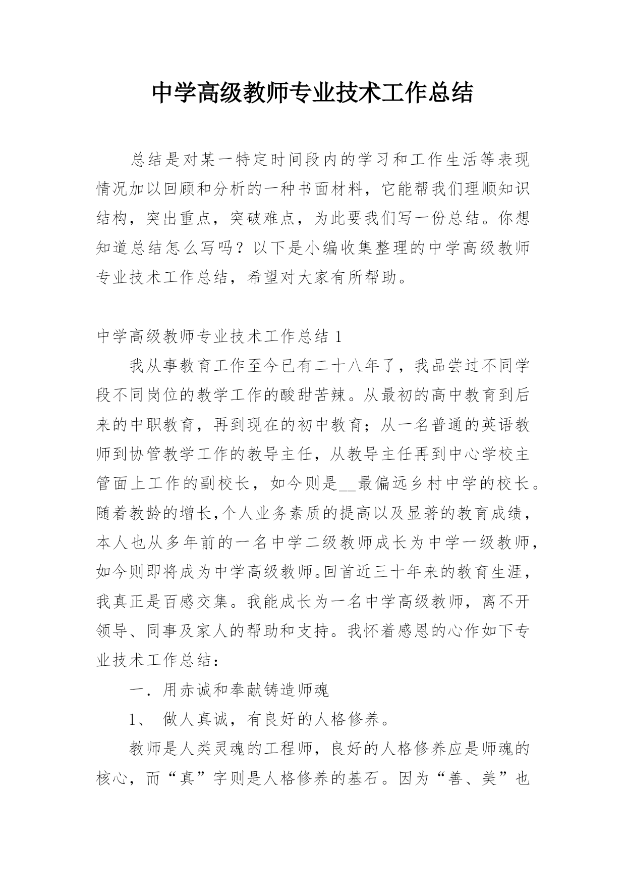 中学高级教师专业技术工作总结总结是对某一特定时间段内的学习和工作生活等表现情况加以回顾和分析的一种书面材料,它能帮我们理顺知识结构,突出重点,突破难点,为此要我们写一份总结。你想知道总结怎么写吗?以下是小编收集整理的中学高级教师专业技术工作总结,希望对大家有所帮助。中学高级教师专业技术工作总结1我从事教育工作至今已有二十八年了,我品尝过不同学段不同岗位的教学工作的酸甜苦辣。从最初的高中教育到后来的中职教育,再到现在的初中教育;从一名普通的英语教师到协管教学工作的教导主任,从教导主任再到中心学校主管面上工作