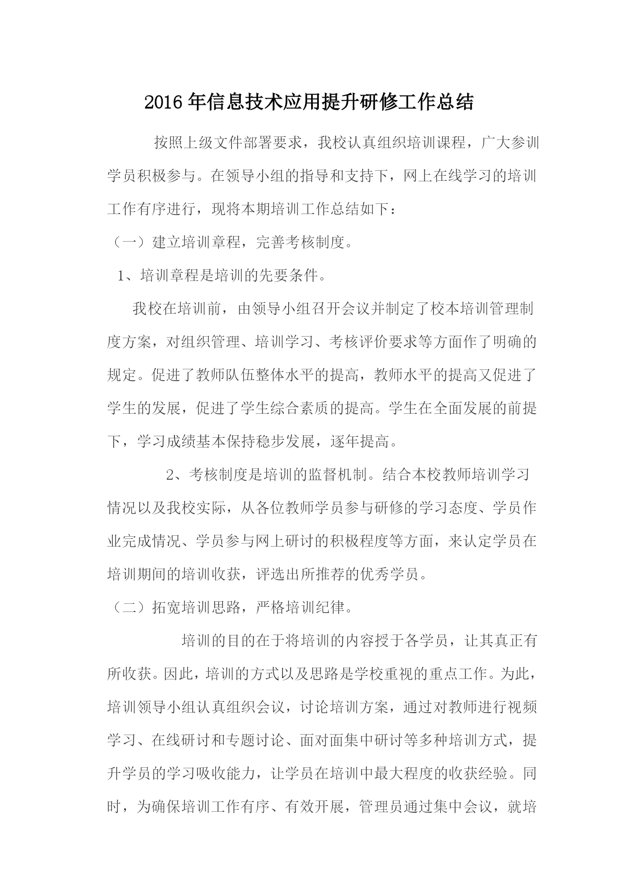 2016年信息技术应用提升研修工作总结按照上级文件部署要求,我校认真组织培训课程,广大参训学员积极参与。在领导小组的指导和支持下,网上在线学习的培训工作有序进行,现将本期培训工作总结如下:(一)建立培训章程,完善考核制度。1、培训章程是培训的先要条件。我校在培训前,由领导小组召开会议并制定了校本培训管理制度方案,对组织管理、培训学习、考核评价要求等方面作了明确的规定。促进了教师队伍整体水平的提高,教师水平的提高又促进了学生的发展,促进了学生综合素质的提高。学生在全面发展的前提下,学习成绩基本保持稳步发展,