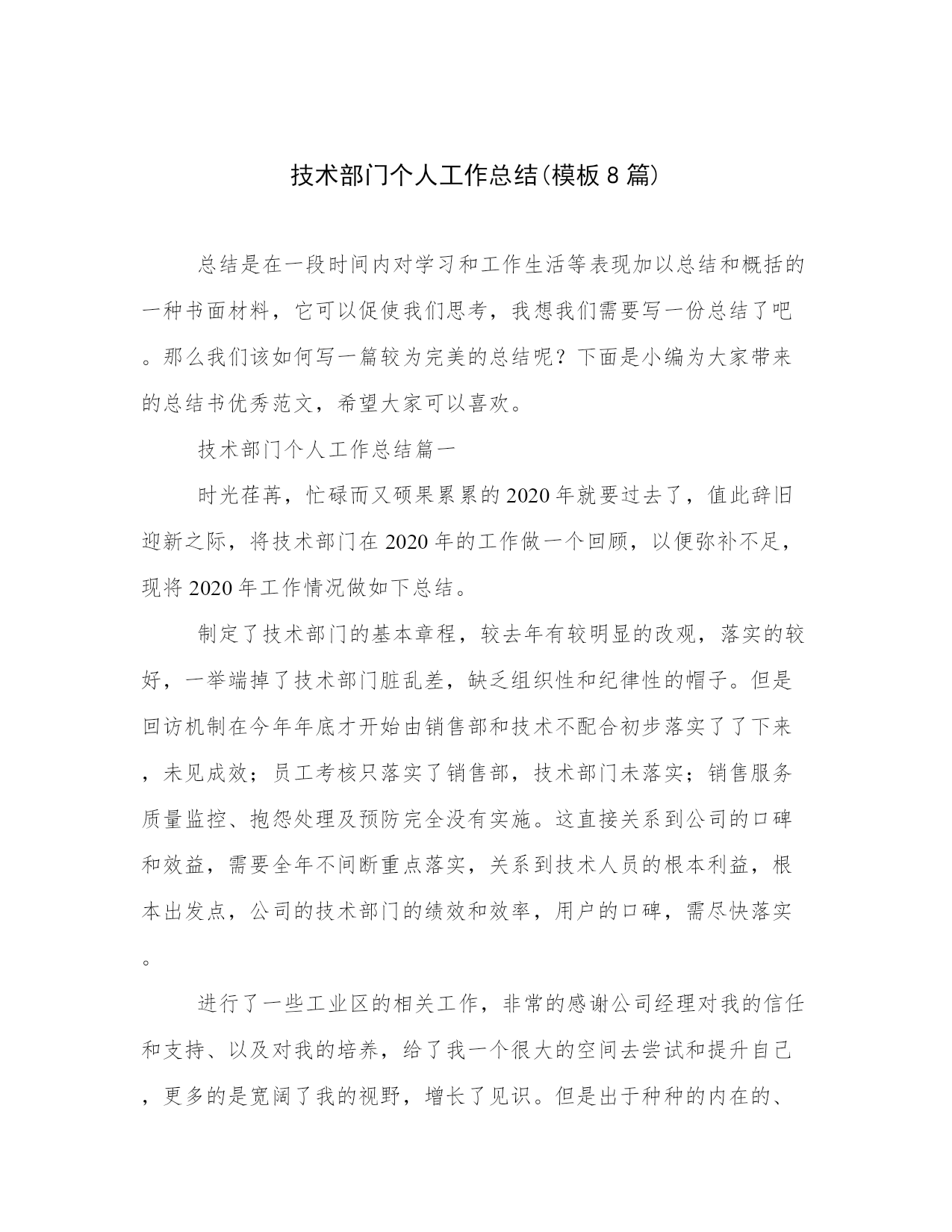 技术部门个人工作总结(模板8篇)总结是在一段时间内对学习和工作生活等表现加以总结和概括的一种书面材料,它可以促使我们思考,我想我们需要写一份总结了吧。那么我们该如何写一篇较为完美的总结呢?下面是小编为大家带来的总结书优秀范文,希望大家可以喜欢。技术部门个人工作总结篇一时光荏苒,忙碌而又硕果累累的2020年就要过去了,值此辞旧迎新之际,将技术部门在2020年的工作做一个回顾,以便弥补不足,现将2020年工作情况做如下总结。制定了技术部门的基本章程,较去年有较明显的改观,落实的较好,一举端掉了技术部门脏乱差,