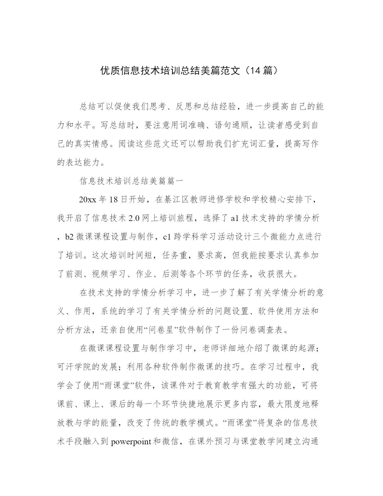 优质信息技术培训总结美篇范文(14篇)总结可以促使我们思考、反思和总结经验,进一步提高自己的能力和水平。写总结时,要注意用词准确、语句通顺,让读者感受到自己的真实情感。阅读这些范文还可以帮助我们扩充词汇量,提高写作的表达能力。信息技术培训总结美篇篇一20xx年18日开始,在綦江区教师进修学校和学校精心安排下,我开启了信息技术2.0网上培训旅程,选择了a1技术支持的学情分析,b2微课课程设置与制作,c1跨学科学习活动设计三个微能力点进行了培训。这次培训时间短,任务重,要求高,但我能按要求认真参加了前测、视频