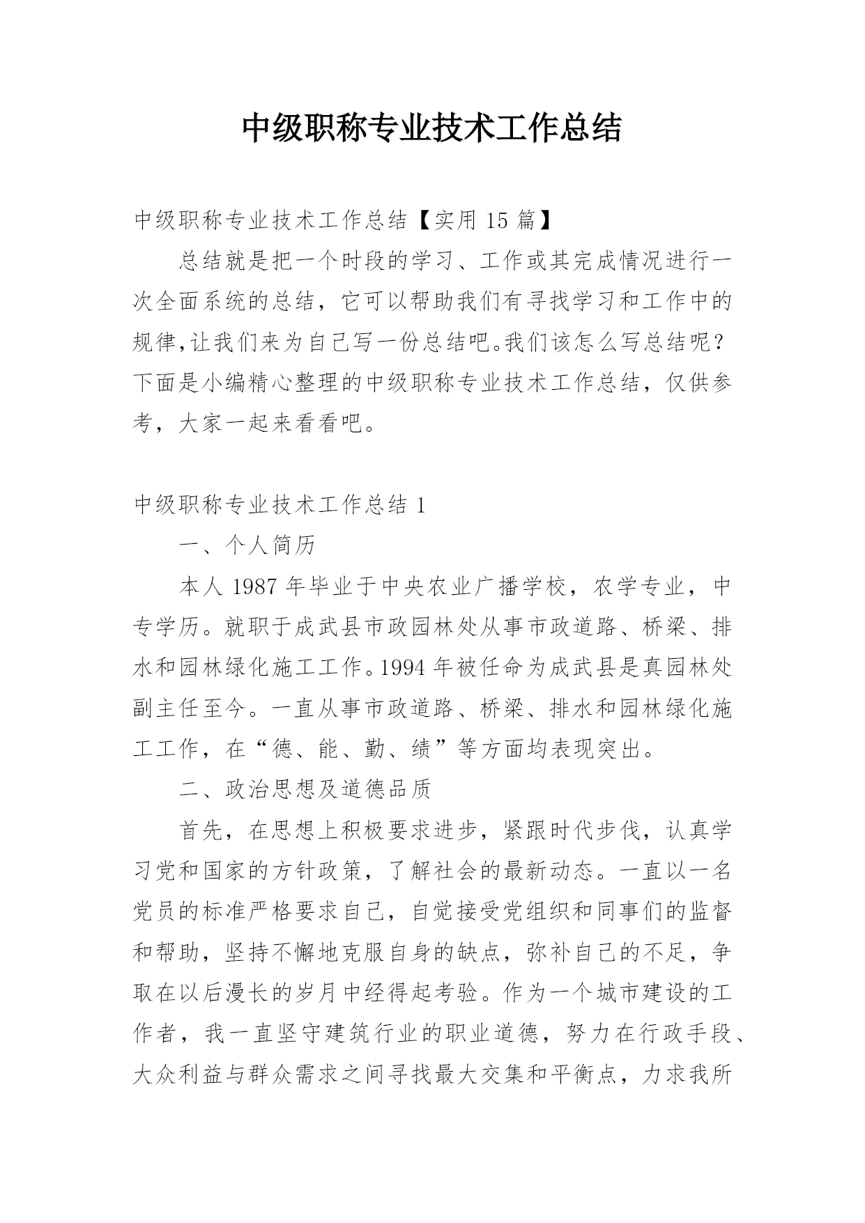 中级职称专业技术工作总结中级职称专业技术工作总结【实用15篇】总结就是把一个时段的学习、工作或其完成情况进行一次全面系统的总结,它可以帮助我们有寻找学习和工作中的规律,让我们来为自己写一份总结吧。我们该怎么写总结呢?下面是小编精心整理的中级职称专业技术工作总结,仅供参考,大家一起来看看吧。中级职称专业技术工作总结1一、个人简历本人1987年毕业于中央农业广播学校,农学专业,中专学历。就职于成武县市政园林处从事市政道路、桥梁、排水和园林绿化施工工作。1994年被任命为成武县是真园林处副主任至今。一直从事市政