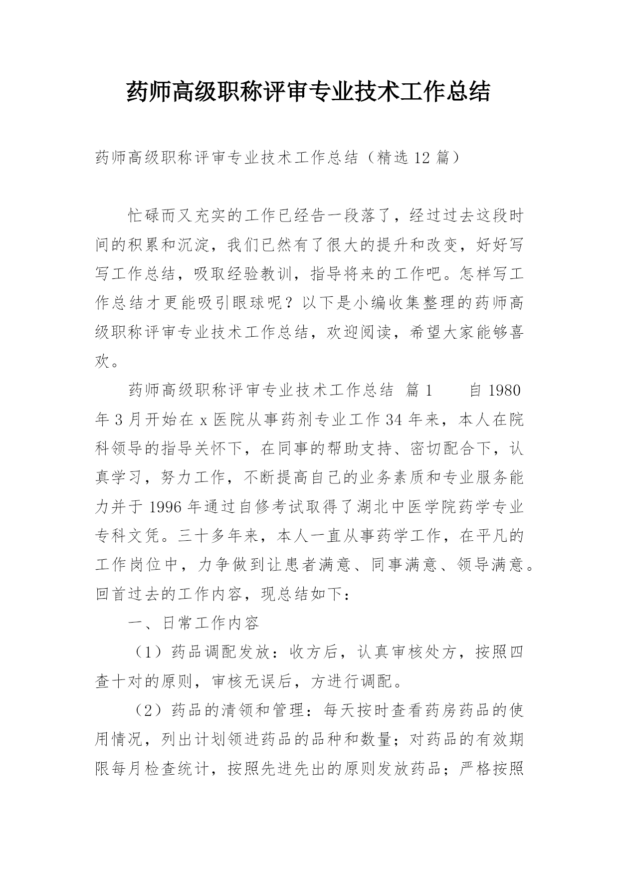 药师高级职称评审专业技术工作总结药师高级职称评审专业技术工作总结(精选12篇)忙碌而又充实的工作已经告一段落了,经过过去这段时间的积累和沉淀,我们已然有了很大的提升和改变,好好写写工作总结,吸取经验教训,指导将来的工作吧。怎样写工作总结才更能吸引眼球呢?以下是小编收集整理的药师高级职称评审专业技术工作总结,欢迎阅读,希望大家能够喜欢。药师高级职称评审专业技术工作总结篇1自1980年3月开始在x医院从事药剂专业工作34年来,本人在院科领导的指导关怀下,在同事的帮助支持、密切配合下,认真学习,努力工作,不断提