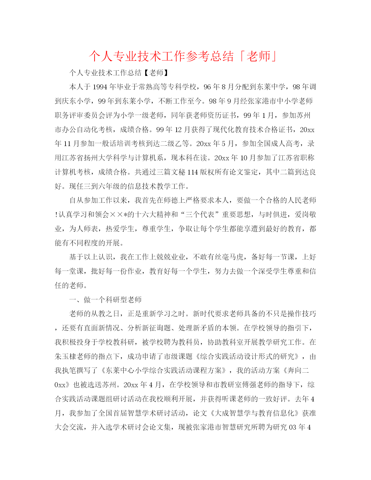 个人专业技术工作参考总结「老师」个人专业技术工作总结【老师】本人于1994年毕业于常熟高等专科学校,96年8月分配到东莱中学,98年调到庆东小学,99年到东莱小学,不断工作至今。98年9月经张家港市中小学老师职务评审委员会评为小学一级老师,同年获老师资历证书,99年1月,参加苏州市办公自动化考核,成绩合格。99年12月获得了现代化教育技术合格证书,20xx年11月参加一般话培训考核到达二级乙等。20xx年5月,参加全国成人高考,录用江苏省扬州大学科学与计算机系,现本科在读。20xx年10月参加了江苏省职称