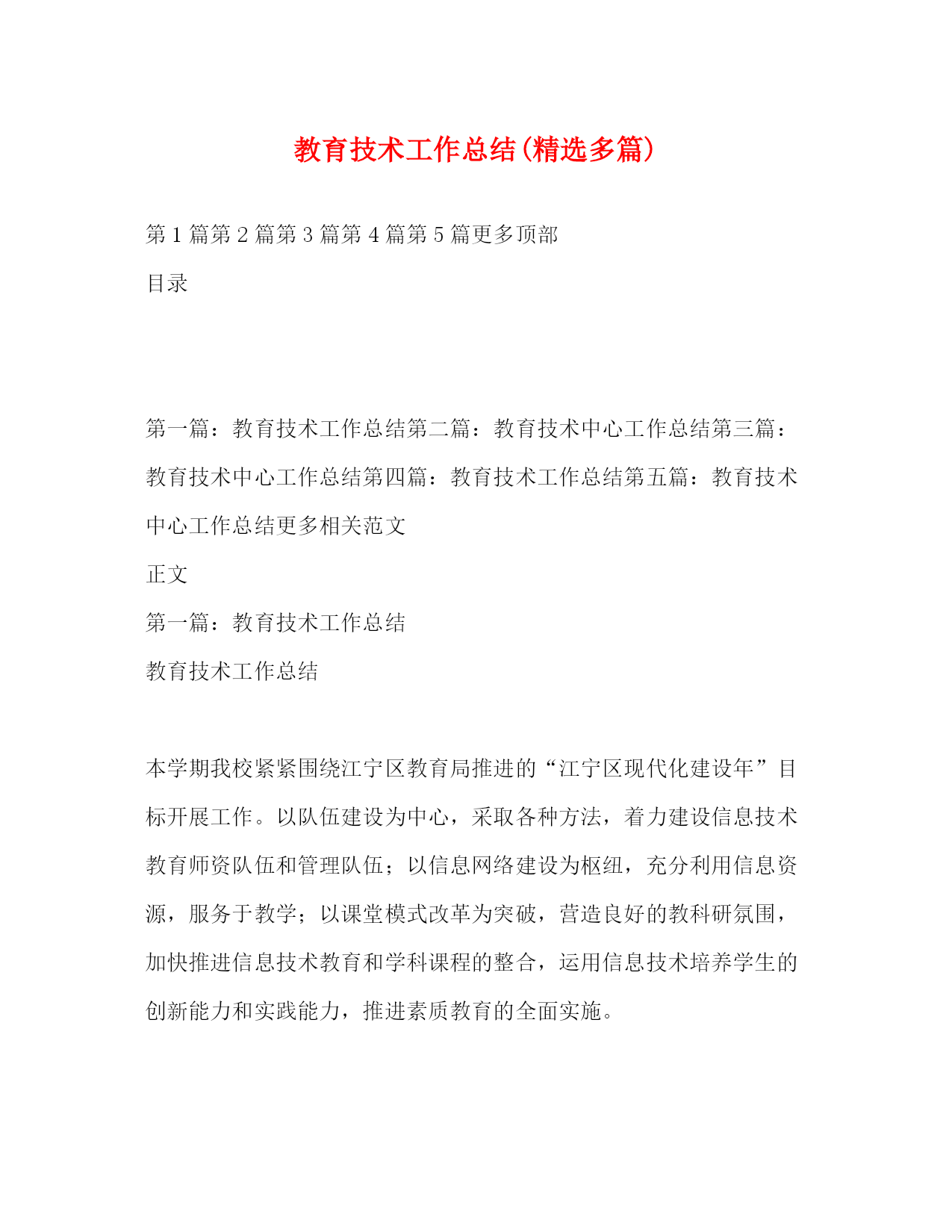 PAGE此资料由网络收集而来,如有侵权请告知上传者立即删除。资料共分享,我们负责传递知识。教育技术工作总结(精选多篇)第1篇第2篇第3篇第4篇第5篇更多顶部目录第一篇:教育技术工作总结第二篇:教育技术中心工作总结第三篇:教育技术中心工作总结第四篇:教育技术工作总结第五篇:教育技术中心工作总结更多相关范文正文第一篇:教育技术工作总结教育技术工作总结本学期我校紧紧围绕江宁区教育局推进的“江宁区现代化建设年”目标开展工作。以队伍建设为中心,采取各种方法,着力建设信息技术教育师资队伍和管理队伍;以信息网络建