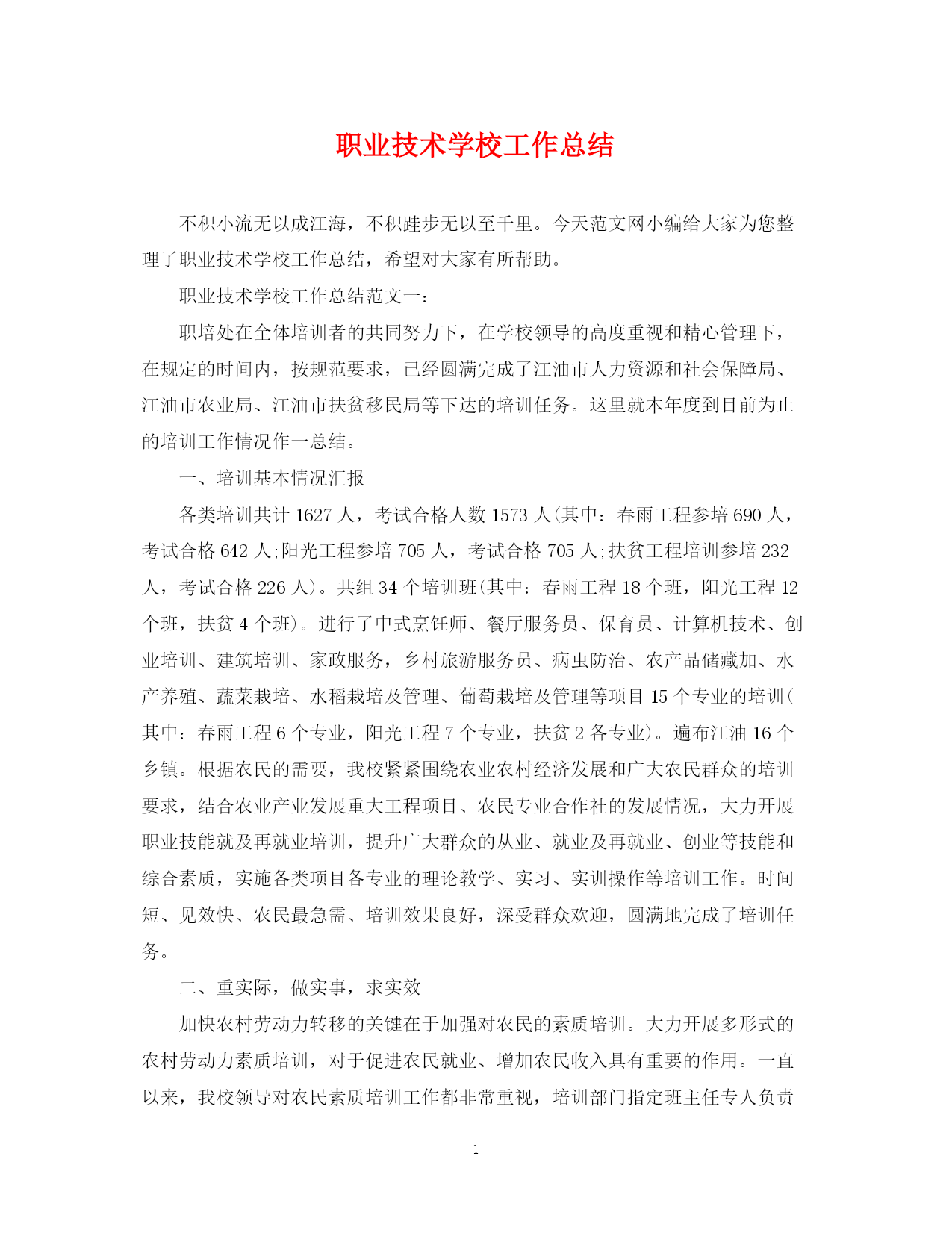 此资料由网络收集而来,如有侵权请告知上传者立即删除。资料共分享,我们负责传递知识。PAGEPAGE7职业技术学校工作总结不积小流无以成江海,不积跬步无以至千里。今天范文网小编给大家为您整理了职业技术学校工作总结,希望对大家有所帮助。职业技术学校工作总结范文一:职培处在全体培训者的共同努力下,在学校领导的高度重视和精心管理下,在规定的时间内,按规范要求,已经圆满完成了江油市人力资源和社会保障局、江油市农业局、江油市扶贫移民局等下达的培训任务。这里就本年度到目前为止的培训工作情况作一总结。一、培训