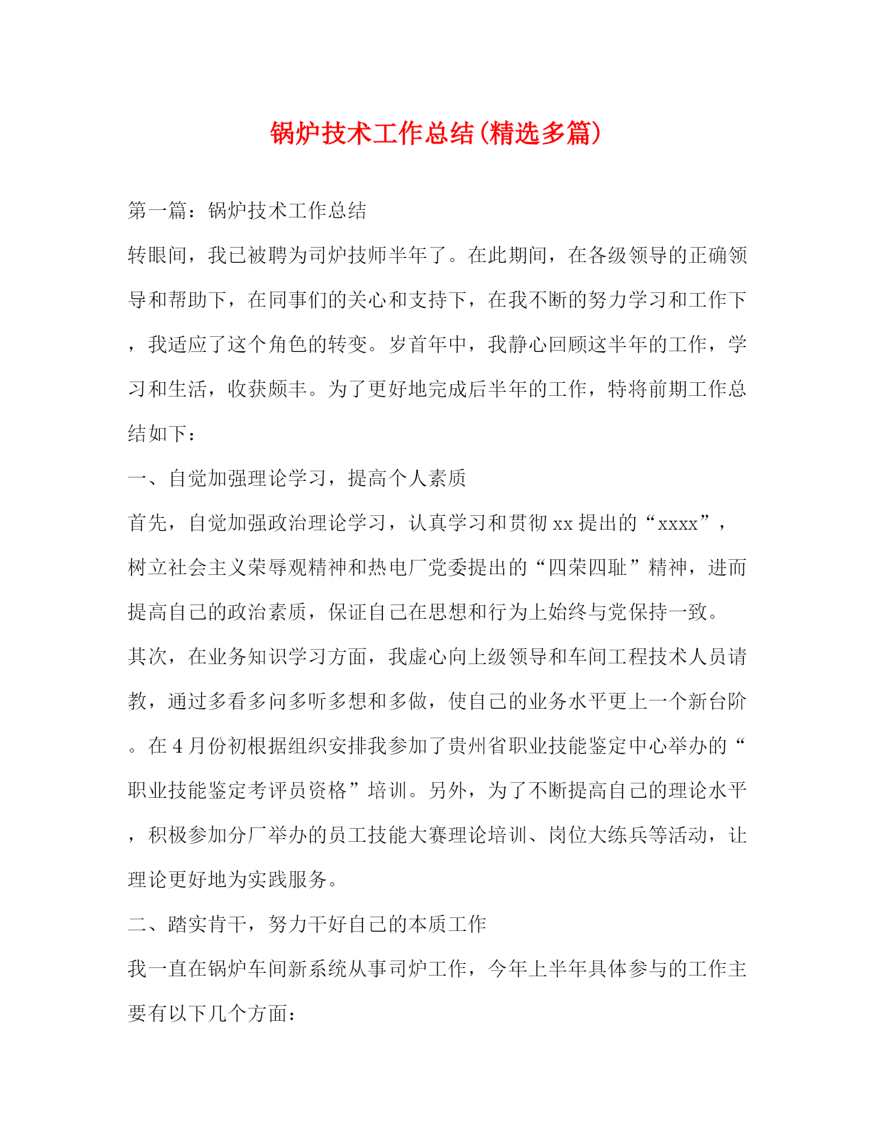 PAGE此资料由网络收集而来,如有侵权请告知上传者立即删除。资料共分享,我们负责传递知识。锅炉技术工作总结(精选多篇)第一篇:锅炉技术工作总结转眼间,我已被聘为司炉技师半年了。在此期间,在各级领导的正确领导和帮助下,在同事们的关心和支持下,在我不断的努力学习和工作下,我适应了这个角色的转变。岁首年中,我静心回顾这半年的工作,学习和生活,收获颇丰。为了更好地完成后半年的工作,特将前期工作总结如下:一、自觉加强理论学习,提高个人素质首先,自觉加强政治理论学习,认真学习和贯彻xx提出的“xxxx”,树立社