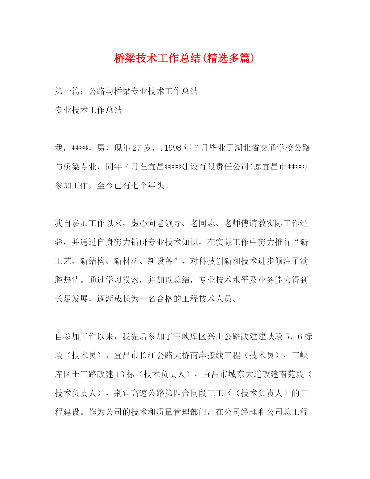 PAGE此资料由网络收集而来,如有侵权请告知上传者立即删除。资料共分享,我们负责传递知识。桥梁技术工作总结(精选多篇)第一篇:公路与桥梁专业技术工作总结专业技术工作总结我,****,男,现年27岁,,1998年7月毕业于湖北省交通学校公路与桥梁专业,同年7月在宜昌****建设有限责任公司(原宜昌市****)参加工作,至今已有七个年头。我自参加工作以来,虚心向老领导、老同志、老师傅请教实际工作经验,并通过自身努力钻研专业技术知识,在实际工作中努力推行“新工艺、新结构、新材料、新设备”,对科技创新和技术