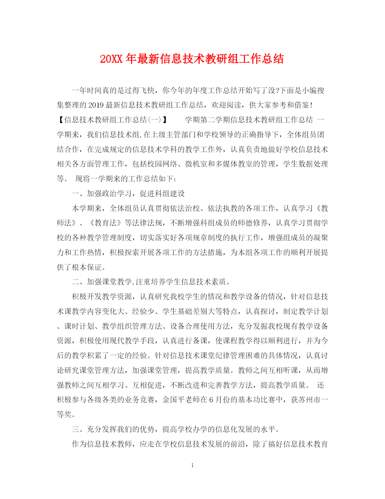 此资料由网络收集而来,如有侵权请告知上传者立即删除。资料共分享,我们负责传递知识。PAGEPAGE520XX年最新信息技术教研组工作总结一年时间真的是过得飞快,你今年的年度工作总结开始写了没?下面是小编搜集整理的2019最新信息技术教研组工作总结,欢迎阅读,供大家参考和借鉴!【信息技术教研组工作总结(一)】学期第二学期信息技术教研组工作总结一学期来,我们信息技术组,在上级主管部门和学校领导的正确指导下,全体组员团结合作,在完成规定的信息技术学科的教学工作外,认真负责地做好学校信息技术相关各方面