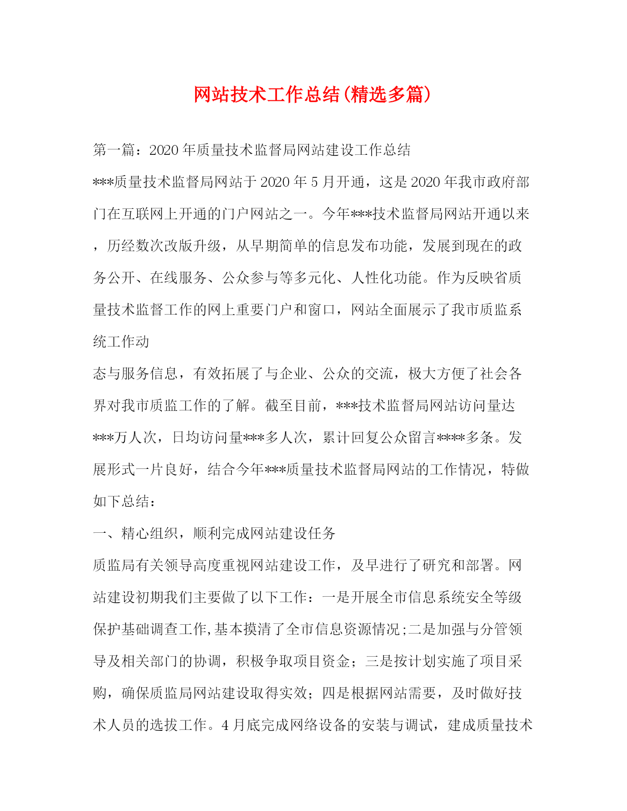 PAGE此资料由网络收集而来,如有侵权请告知上传者立即删除。资料共分享,我们负责传递知识。网站技术工作总结(精选多篇)第一篇:2020年质量技术监督局网站建设工作总结***质量技术监督局网站于2020年5月开通,这是2020年我市政府部门在互联网上开通的门户网站之一。今年***技术监督局网站开通以来,历经数次改版升级,从早期简单的信息发布功能,发展到现在的政务公开、在线服务、公众参与等多元化、人性化功能。作为反映省质量技术监督工作的网上重要门户和窗口,网站全面展示了我市质监系统工作动态与服务信息,有