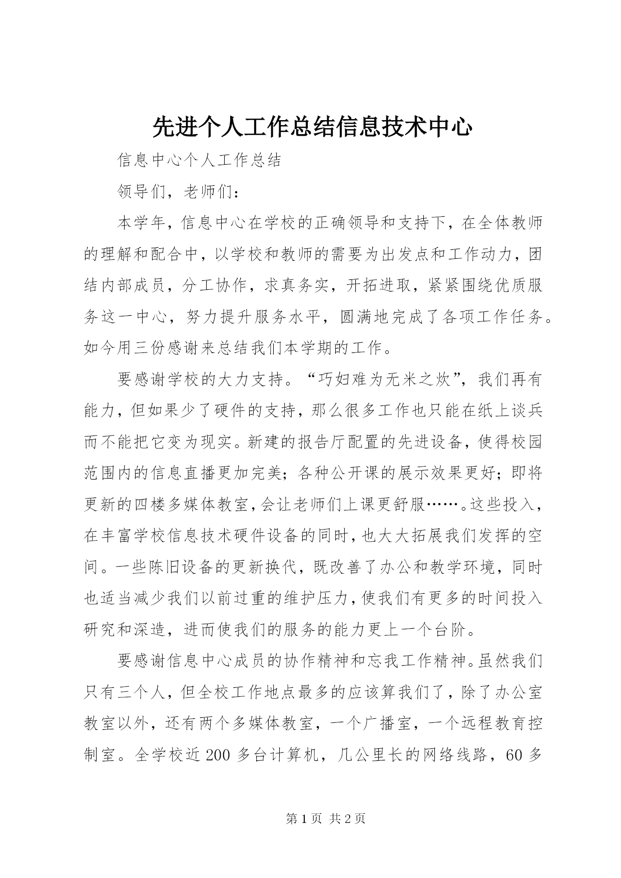 第PAGE\*Arabic\*MERGEFORMAT2页共NUMPAGES\*MERGEFORMAT2页先进个人工作总结信息技术中心信息中心个人工作总结领导们,老师们:本学年,信息中心在学校的正确领导和支持下,在全体教师的理解和配合中,以学校和教师的需要为出发点和工作动力,团结内部成员,分工协作,求真务实,开拓进取,紧紧围绕优质服务这一中心,努力提升服务水平,圆满地完成了各项工作任务。如今用三份感谢来总结我们本学期的工作。要感谢学校的大力支持。“巧妇难为无米之炊”,我们再有能力,但如果少了硬件