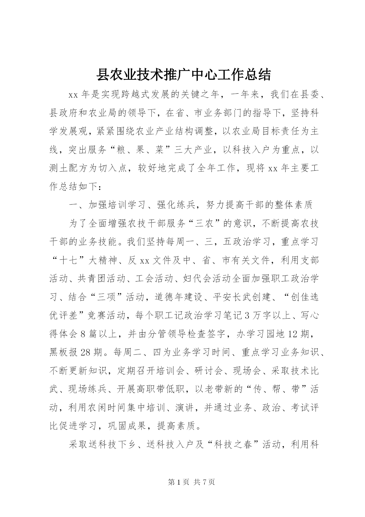第PAGE\*Arabic\*MERGEFORMAT7页共NUMPAGES\*MERGEFORMAT7页县农业技术推广中心工作总结xx年是实现跨越式发展的关键之年,一年来,我们在县委、县政府和农业局的领导下,在省、市业务部门的指导下,坚持科学发展观,紧紧围绕农业产业结构调整,以农业局目标责任为主线,突出服务“粮、果、菜”三大产业,以科技入户为重点,以测土配方为切入点,较好地完成了全年工作,现将xx年主要工作总结如下:一、加强培训学习、强化练兵,努力提高干部的整体素质为了全面增强农技干部服务“三