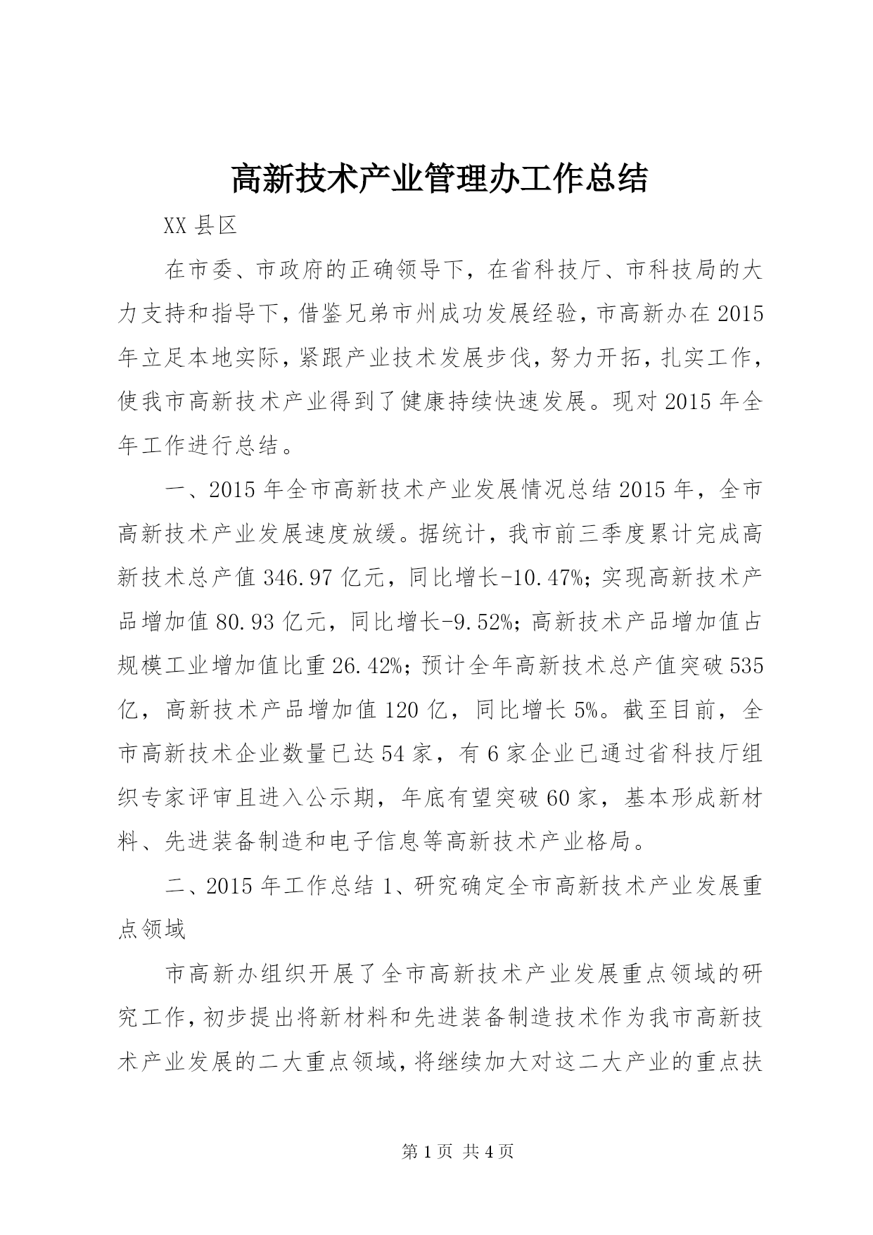 第PAGE\*Arabic\*MERGEFORMAT4页共NUMPAGES\*MERGEFORMAT4页高新技术产业管理办工作总结XX县区在市委、市政府的正确领导下,在省科技厅、市科技局的大力支持和指导下,借鉴兄弟市州成功发展经验,市高新办在2015年立足本地实际,紧跟产业技术发展步伐,努力开拓,扎实工作,使我市高新技术产业得到了健康持续快速发展。现对2015年全年工作进行总结。一、2015年全市高新技术产业发展情况总结2015年,全市高新技术产业发展速度放缓。据统计,我市前三季度累计完成高新