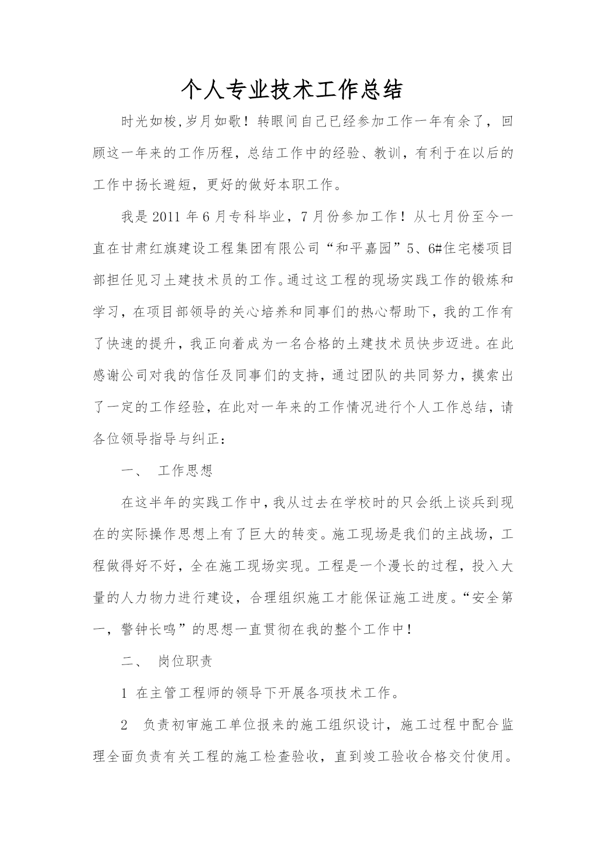 个人专业技术工作总结时光如梭,岁月如歌!转眼间自己已经参加工作一年有余了,回顾这一年来的工作历程,总结工作中的经验、教训,有利于在以后的工作中扬长避短,更好的做好本职工作。我是2011年6月专科毕业,7月份参加工作!从七月份至今一直在甘肃红旗建设工程集团有限公司“和平嘉园”5、6#住宅楼项目部担任见习土建技术员的工作。通过这工程的现场实践工作的锻炼和学习,在项目部领导的关心培养和同事们的热心帮助下,我的工作有了快速的提升,我正向着成为一名合格的土建技术员快步迈进。在此感谢公司对我的信任及同事们的支持,通过
