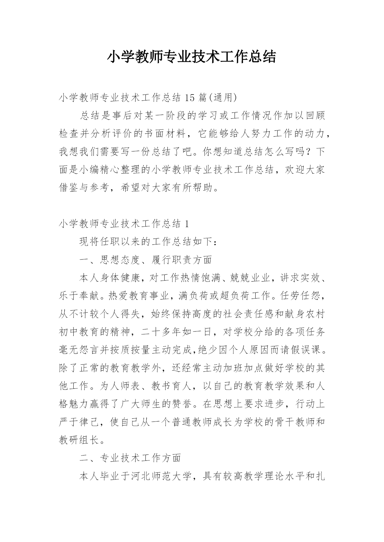 小学教师专业技术工作总结小学教师专业技术工作总结15篇(通用)总结是事后对某一阶段的学习或工作情况作加以回顾检查并分析评价的书面材料,它能够给人努力工作的动力,我想我们需要写一份总结了吧。你想知道总结怎么写吗?下面是小编精心整理的小学教师专业技术工作总结,欢迎大家借鉴与参考,希望对大家有所帮助。小学教师专业技术工作总结1现将任职以来的工作总结如下:一、思想态度、履行职责方面本人身体健康,对工作热情饱满、兢兢业业,讲求实效、乐于奉献。热爱教育事业,满负荷或超负荷工作。任劳任怨,从不计较个人得失,始终保持高度