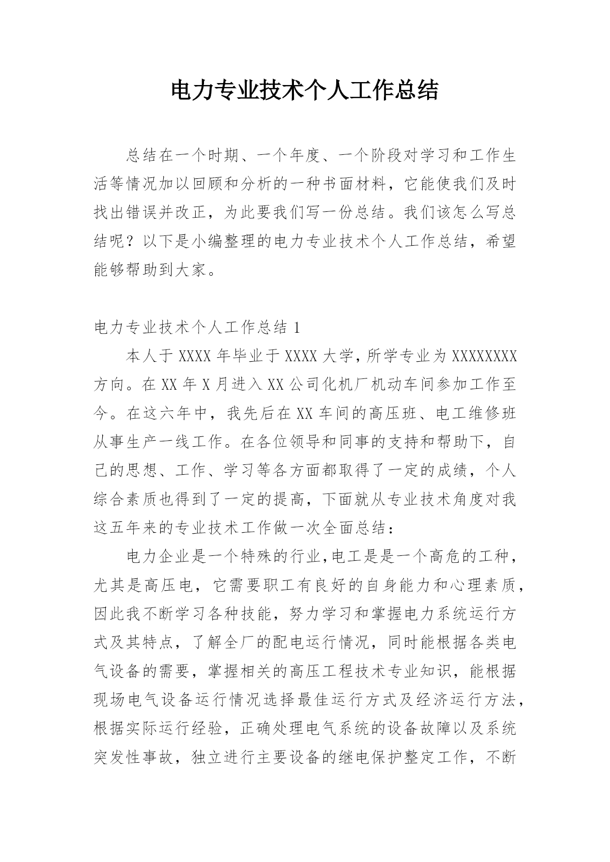 电力专业技术个人工作总结总结在一个时期、一个年度、一个阶段对学习和工作生活等情况加以回顾和分析的一种书面材料,它能使我们及时找出错误并改正,为此要我们写一份总结。我们该怎么写总结呢?以下是小编整理的电力专业技术个人工作总结,希望能够帮助到大家。电力专业技术个人工作总结1本人于XXXX年毕业于XXXX大学,所学专业为XXXXXXXX方向。在XX年X月进入XX公司化机厂机动车间参加工作至今。在这六年中,我先后在XX车间的高压班、电工维修班从事生产一线工作。在各位领导和同事的支持和帮助下,自己的思想、工作、学习