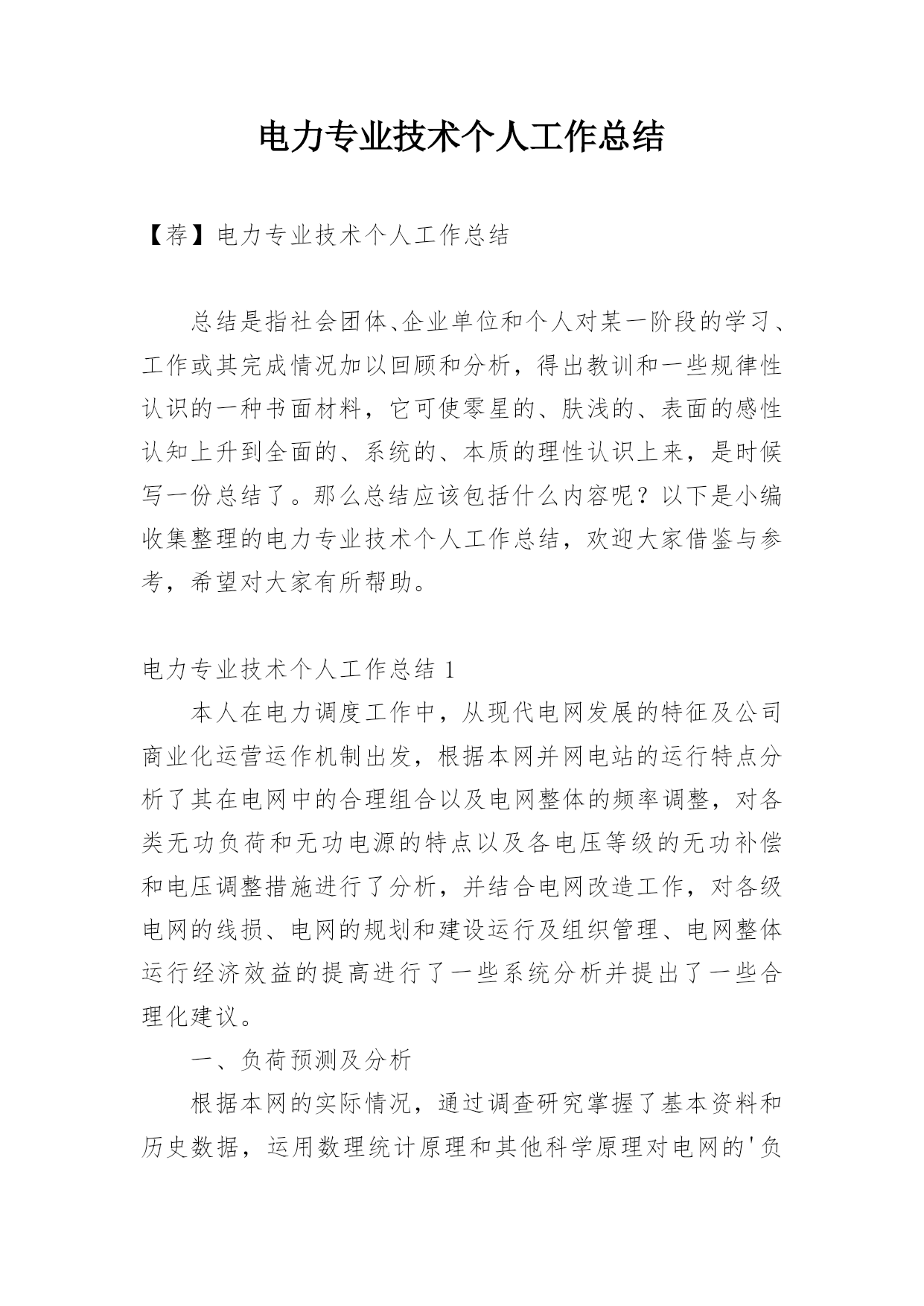 电力专业技术个人工作总结【荐】电力专业技术个人工作总结总结是指社会团体、企业单位和个人对某一阶段的学习、工作或其完成情况加以回顾和分析,得出教训和一些规律性认识的一种书面材料,它可使零星的、肤浅的、表面的感性认知上升到全面的、系统的、本质的理性认识上来,是时候写一份总结了。那么总结应该包括什么内容呢?以下是小编收集整理的电力专业技术个人工作总结,欢迎大家借鉴与参考,希望对大家有所帮助。电力专业技术个人工作总结1本人在电力调度工作中,从现代电网发展的特征及公司商业化运营运作机制出发,根据本网并网电站的运行特