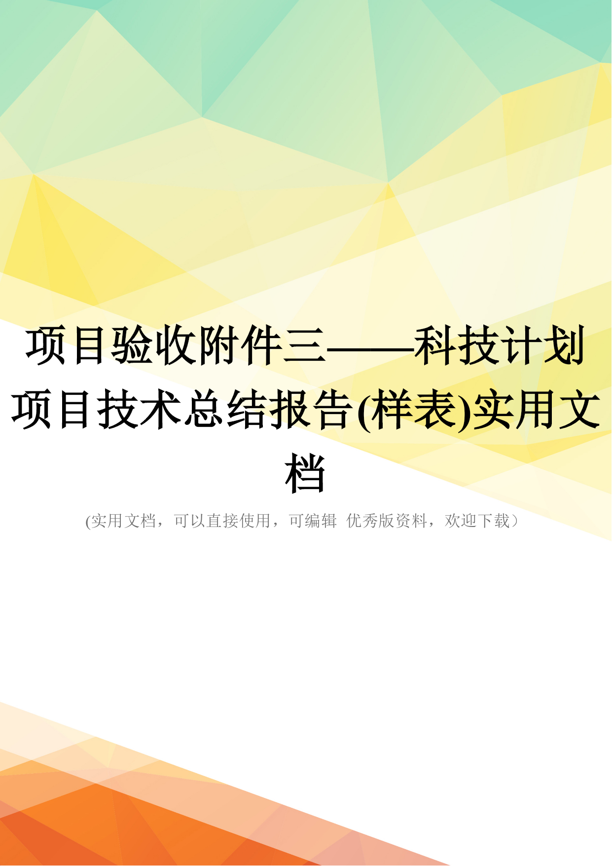 项目验收附件三——科技计划项目技术总结报告(样表)实用文档(实用文档,可以直接使用,可编辑优秀版资料,欢迎下载)城关区科技项目验收附件三城关区科技计划项目技术总结报告项目名称:项目编号:起止时间:承担单位(盖章):项目负责人:填报日期:目录一、项目概况1、项目提出的背景2、项目基本情况概述二、项目项目主要技术及基本原理三、技术特点及技术路线1、技术特点及创新点2、解决的关键技术问题3、技术路线四、项目取得的技术成果五、项目的适用范围六、项目存在的问题及改进方法项目总结报告范文(一)时间过得真快,转眼间,在