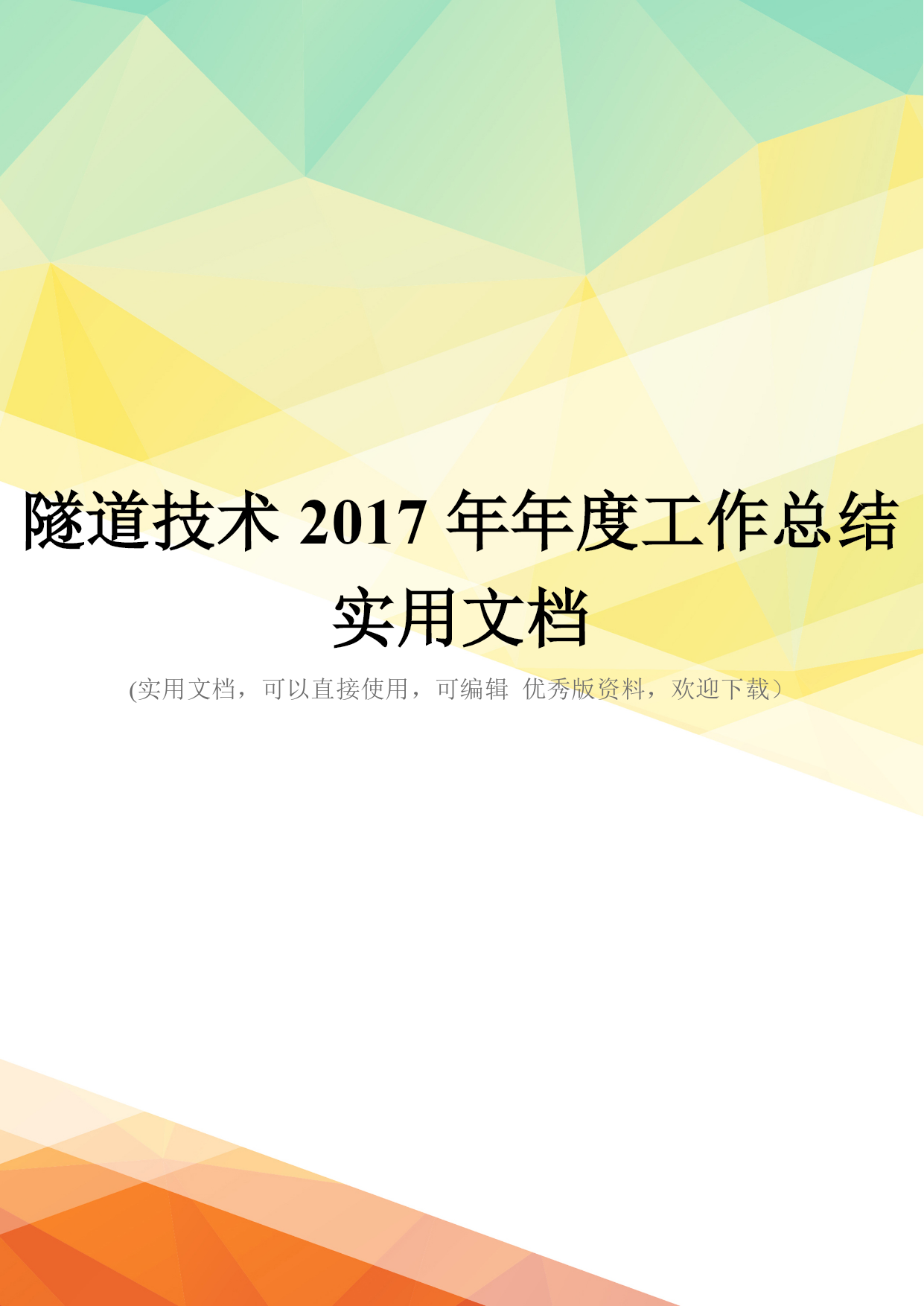 隧道技术2017年年度工作总结实用文档(实用文档,可以直接使用,可编辑优秀版资料,欢迎下载)工作总结尊敬的各位领导:自来2021年9月到银西项目部以来,我一直担任洪德隧道技术员一职。在日常工作、生活中严格遵守公司及项目部的各项规章制度,积极服从领导的工作安排,圆满完成领导安排的各项工作,维护集体荣誉,思想上要求进步,积极响应公司的号召,认真贯彻执行公司文件及会议精神.工作积极努力,任劳任怨,认真学习相关试验知识,不断充实完善自己。2021年即将过去,新的一年即将开始,在这辞旧迎新之际,回顾过去一年的工作,