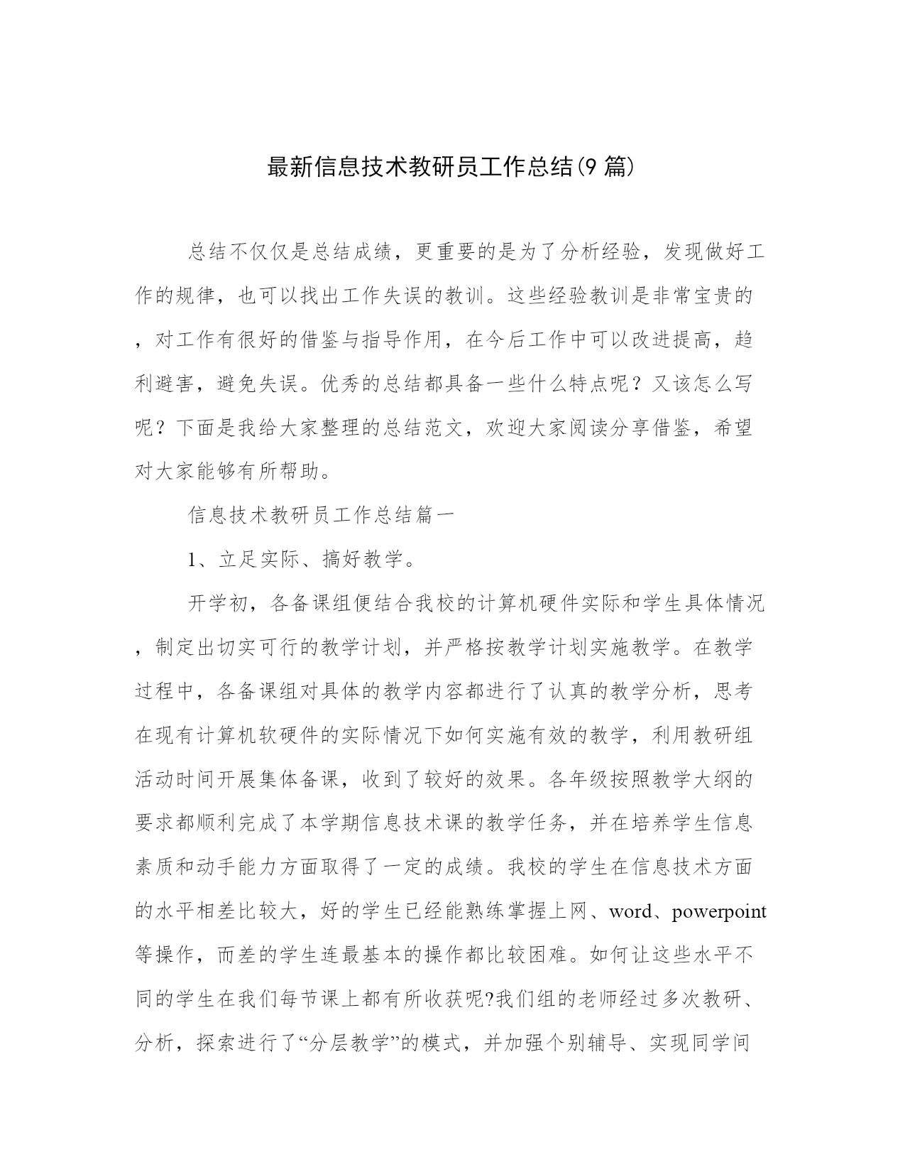 最新信息技术教研员工作总结(9篇)总结不仅仅是总结成绩,更重要的是为了分析经验,发现做好工作的规律,也可以找出工作失误的教训。这些经验教训是非常宝贵的,对工作有很好的借鉴与指导作用,在今后工作中可以改进提高,趋利避害,避免失误。优秀的总结都具备一些什么特点呢?又该怎么写呢?下面是我给大家整理的总结范文,欢迎大家阅读分享借鉴,希望对大家能够有所帮助。信息技术教研员工作总结篇一1、立足实际、搞好教学。开学初,各备课组便结合我校的计算机硬件实际和学生具体情况,制定出切实可行的教学计划,并严格按教学计划实施教学。