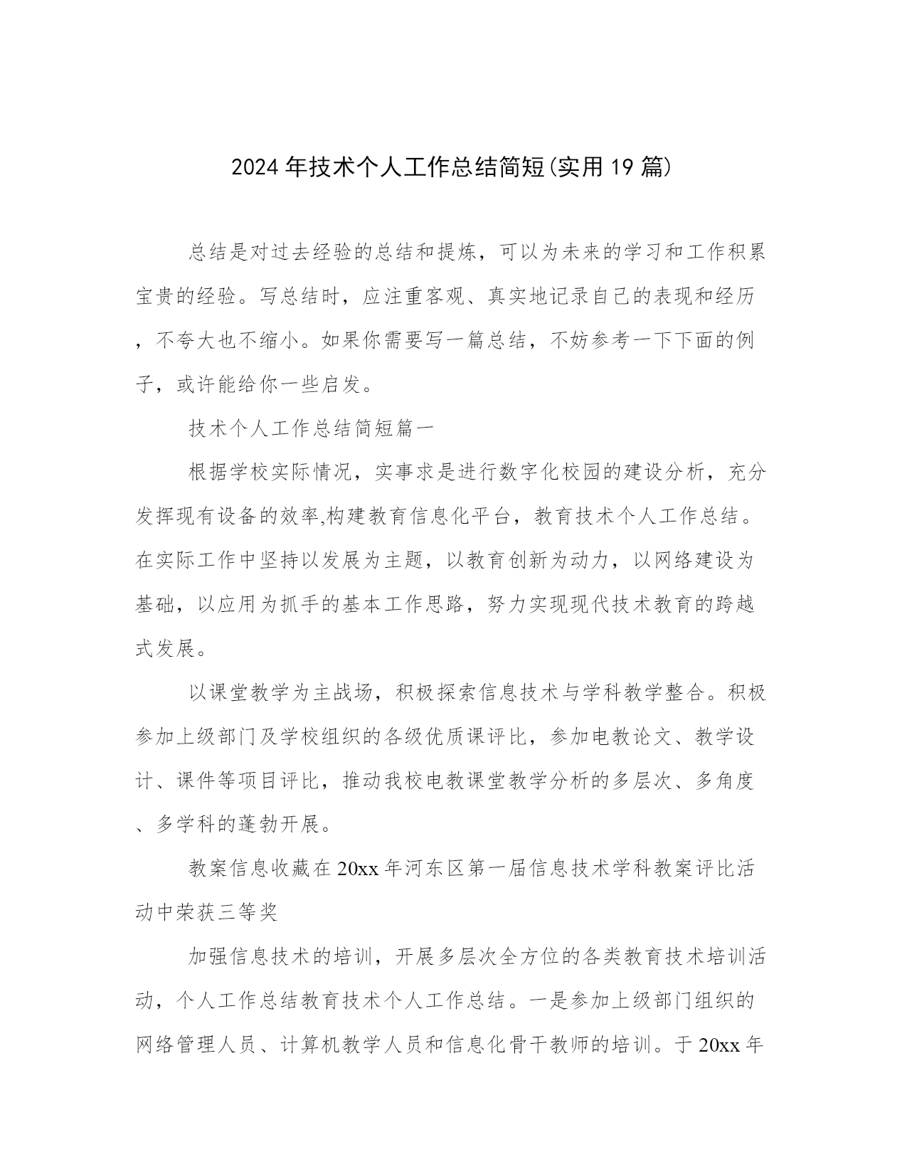 2024年技术个人工作总结简短(实用19篇)总结是对过去经验的总结和提炼,可以为未来的学习和工作积累宝贵的经验。写总结时,应注重客观、真实地记录自己的表现和经历,不夸大也不缩小。如果你需要写一篇总结,不妨参考一下下面的例子,或许能给你一些启发。技术个人工作总结简短篇一根据学校实际情况,实事求是进行数字化校园的建设分析,充分发挥现有设备的效率,构建教育信息化平台,教育技术个人工作总结。在实际工作中坚持以发展为主题,以教育创新为动力,以网络建设为基础,以应用为抓手的基本工作思路,努力实现现代技术教育的跨越式发