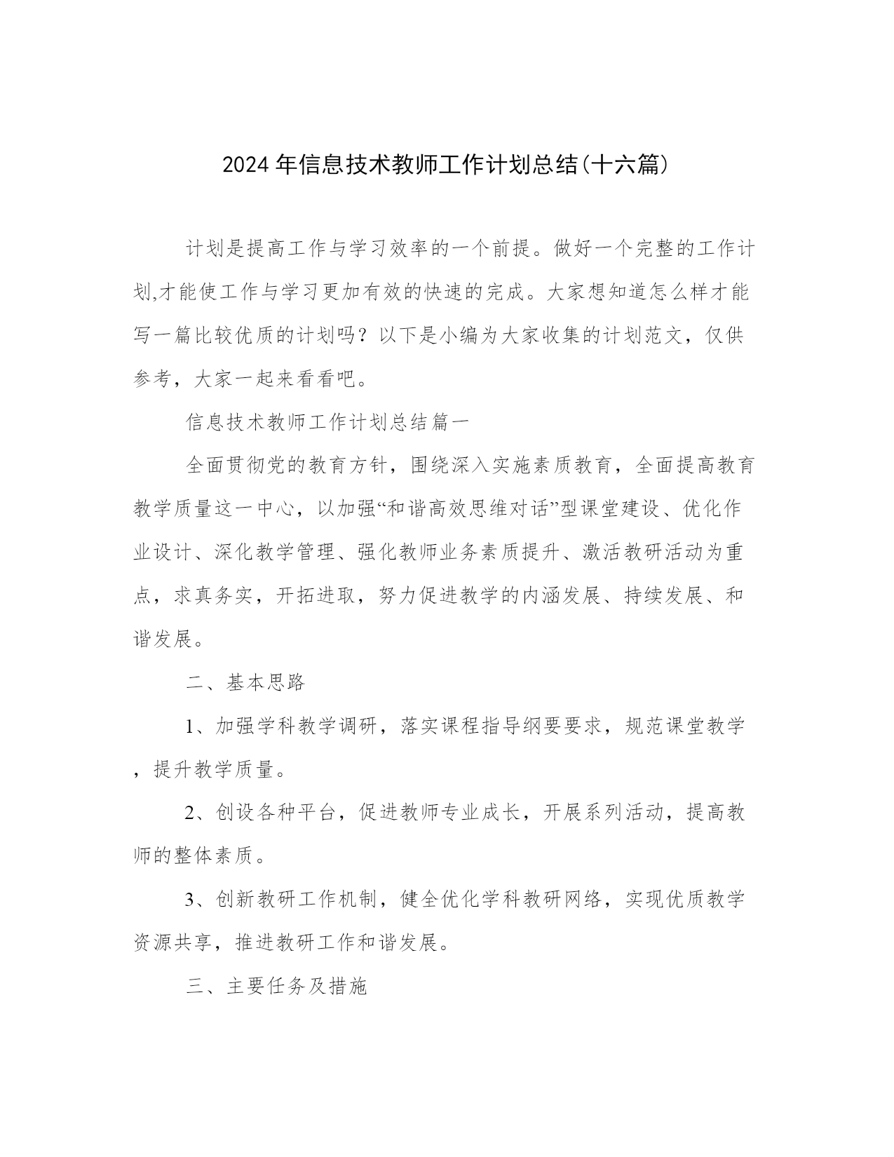 2024年信息技术教师工作计划总结(十六篇)计划是提高工作与学习效率的一个前提。做好一个完整的工作计划,才能使工作与学习更加有效的快速的完成。大家想知道怎么样才能写一篇比较优质的计划吗?以下是小编为大家收集的计划范文,仅供参考,大家一起来看看吧。信息技术教师工作计划总结篇一全面贯彻党的教育方针,围绕深入实施素质教育,全面提高教育教学质量这一中心,以加强“和谐高效思维对话”型课堂建设、优化作业设计、深化教学管理、强化教师业务素质提升、激活教研活动为重点,求真务实,开拓进取,努力促进教学的内涵发展、持续发展、