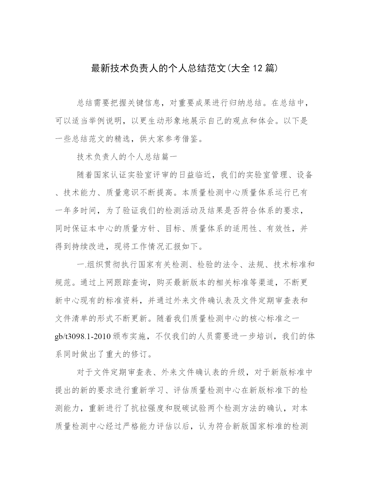 最新技术负责人的个人总结范文(大全12篇)总结需要把握关键信息,对重要成果进行归纳总结。在总结中,可以适当举例说明,以更生动形象地展示自己的观点和体会。以下是一些总结范文的精选,供大家参考借鉴。技术负责人的个人总结篇一随着国家认证实验室评审的日益临近,我们的实验室管理、设备、技术能力、质量意识不断提高。本质量检测中心质量体系运行已有一年多时间,为了验证我们的检测活动及结果是否符合体系的要求,同时保证本中心的质量方针、目标、质量体系的适用性、有效性,并得到持续改进,现将工作情况汇报如下。一.组织贯彻执行国家