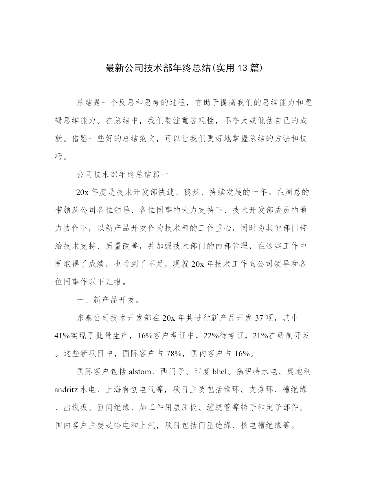 最新公司技术部年终总结(实用13篇)总结是一个反思和思考的过程,有助于提高我们的思维能力和逻辑思维能力。在总结中,我们要注重客观性,不夸大或低估自己的成就。借鉴一些好的总结范文,可以让我们更好地掌握总结的方法和技巧。公司技术部年终总结篇一20x年度是技术开发部快速、稳步、持续发展的一年。在周总的带领及公司各位领导、各位同事的大力支持下、技术开发部成员的通力协作下,以新产品开发作为技术部的工作重心,同时为其他部门带给技术支持、质量改善,并加强技术部门的内部管理,在这些工作中既取得了成绩,也看到了不足,现就2