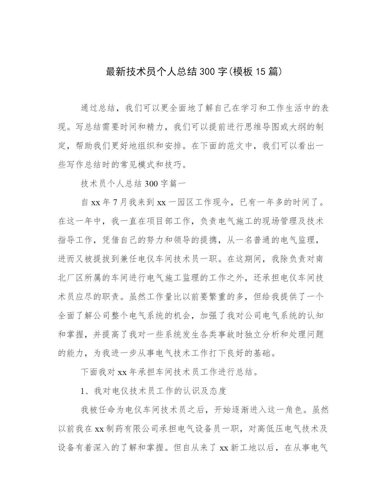 最新技术员个人总结300字(模板15篇)通过总结,我们可以更全面地了解自己在学习和工作生活中的表现。写总结需要时间和精力,我们可以提前进行思维导图或大纲的制定,帮助我们更好地组织和安排。在下面的范文中,我们可以看出一些写作总结时的常见模式和技巧。技术员个人总结300字篇一自xx年7月我来到xx一园区工作现今,已有一年多的时间了。在这一年中,我一直在项目部工作,负责电气施工的现场管理及技术指导工作,凭借自己的努力和领导的提携,从一名普通的电气监理,进而又被提拔到兼任电仪车间技术员一职。在这期间,我除负责对南