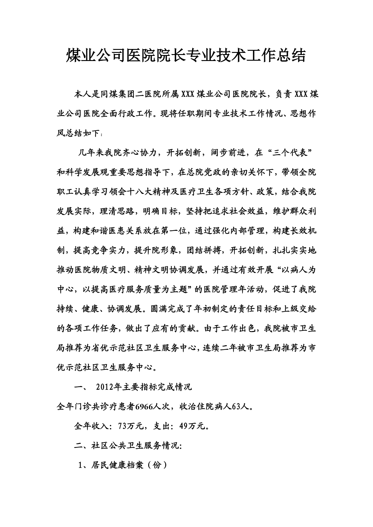 煤业公司医院院长专业技术工作总结本人是同煤集团二医院所属XXX煤业公司医院院长,负责XXX煤业公司医院全面行政工作。现将任职期间专业技术工作情况、思想作风总结如下:几年来我院齐心协力,开拓创新,阔步前进,在“三个代表”和科学发展观重要思想指导下,在总院党政的亲切关怀下,带领全院职工认真学习领会十八大精神及医疗卫生各项方针、政策,结合我院发展实际,理清思路,明确目标,坚持把追求社会效益,维护群众利益,构建和谐医患关系放在第一位,通过强化内部管理,构建长效机制,提高竞争实力,提升院形象,团结拼搏,开拓创新,扎