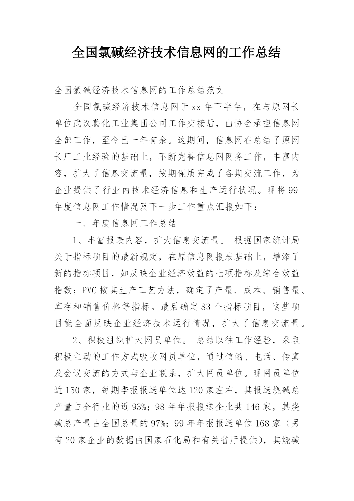 全国氯碱经济技术信息网的工作总结全国氯碱经济技术信息网的工作总结范文全国氯碱经济技术信息网于xx年下半年,在与原网长单位武汉葛化工业集团公司工作交接后,由协会承担信息网全部工作,至今已一年有余。这期间,信息网在总结了原网长厂工业经验的基础上,不断完善信息网网务工作,丰富内容,扩大了信息交流量,按期保质完成了各期交流工作,为企业提供了行业内技术经济信息和生产运行状况。现将99年度信息网工作情况及下一步工作重点汇报如下:一、年度信息网工作总结1、丰富报表内容,扩大信息交流量。根据国家统计局关于指标项目的最新规
