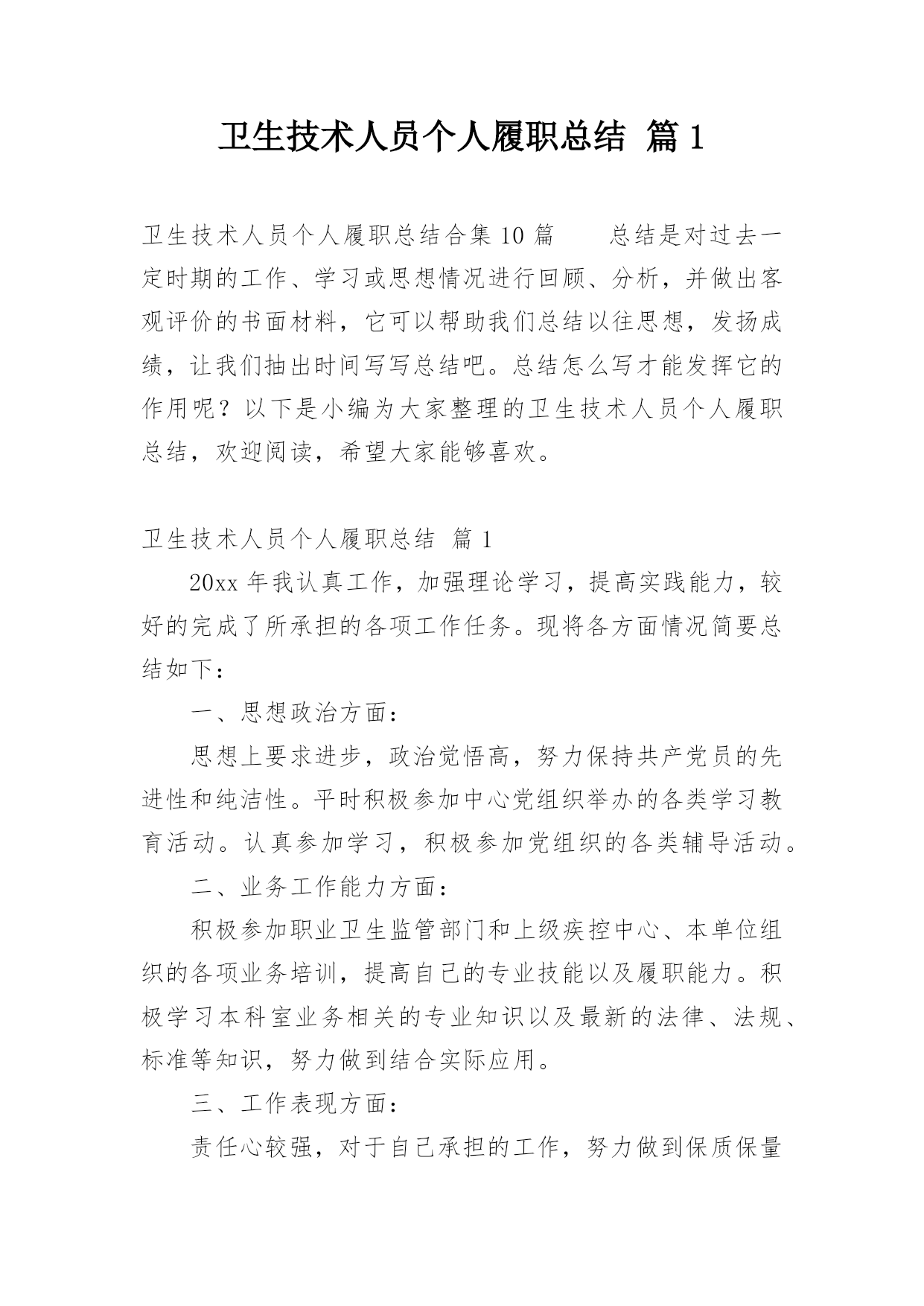 卫生技术人员个人履职总结篇1卫生技术人员个人履职总结合集10篇总结是对过去一定时期的工作、学习或思想情况进行回顾、分析,并做出客观评价的书面材料,它可以帮助我们总结以往思想,发扬成绩,让我们抽出时间写写总结吧。总结怎么写才能发挥它的作用呢?以下是小编为大家整理的卫生技术人员个人履职总结,欢迎阅读,希望大家能够喜欢。卫生技术人员个人履职总结篇120xx年我认真工作,加强理论学习,提高实践能力,较好的完成了所承担的各项工作任务。现将各方面情况简要总结如下:一、思想政治方面:思想上要求进步,政治觉悟高,努力保持