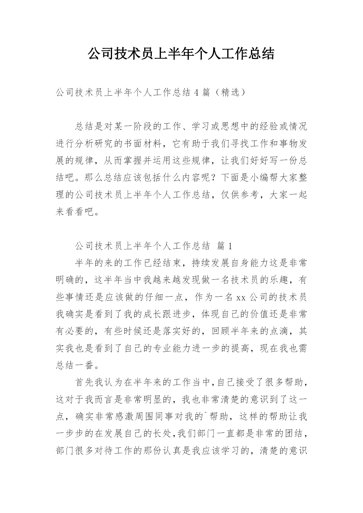 公司技术员上半年个人工作总结公司技术员上半年个人工作总结4篇(精选)总结是对某一阶段的工作、学习或思想中的经验或情况进行分析研究的书面材料,它有助于我们寻找工作和事物发展的规律,从而掌握并运用这些规律,让我们好好写一份总结吧。那么总结应该包括什么内容呢?下面是小编帮大家整理的公司技术员上半年个人工作总结,仅供参考,大家一起来看看吧。公司技术员上半年个人工作总结篇1半年的来的工作已经结束,持续发展自身能力这是非常明确的,这半年当中我越来越发现做一名技术员的乐趣,有些事情还是应该做的仔细一点,作为一名xx公司