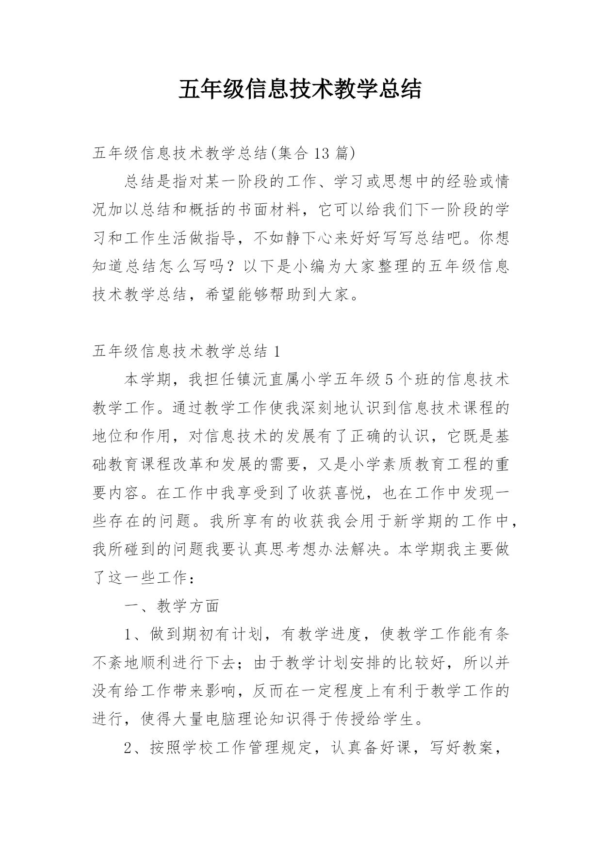 五年级信息技术教学总结五年级信息技术教学总结(集合13篇)总结是指对某一阶段的工作、学习或思想中的经验或情况加以总结和概括的书面材料,它可以给我们下一阶段的学习和工作生活做指导,不如静下心来好好写写总结吧。你想知道总结怎么写吗?以下是小编为大家整理的五年级信息技术教学总结,希望能够帮助到大家。五年级信息技术教学总结1本学期,我担任镇沅直属小学五年级5个班的信息技术教学工作。通过教学工作使我深刻地认识到信息技术课程的地位和作用,对信息技术的发展有了正确的认识,它既是基础教育课程改革和发展的需要,又是小学素质