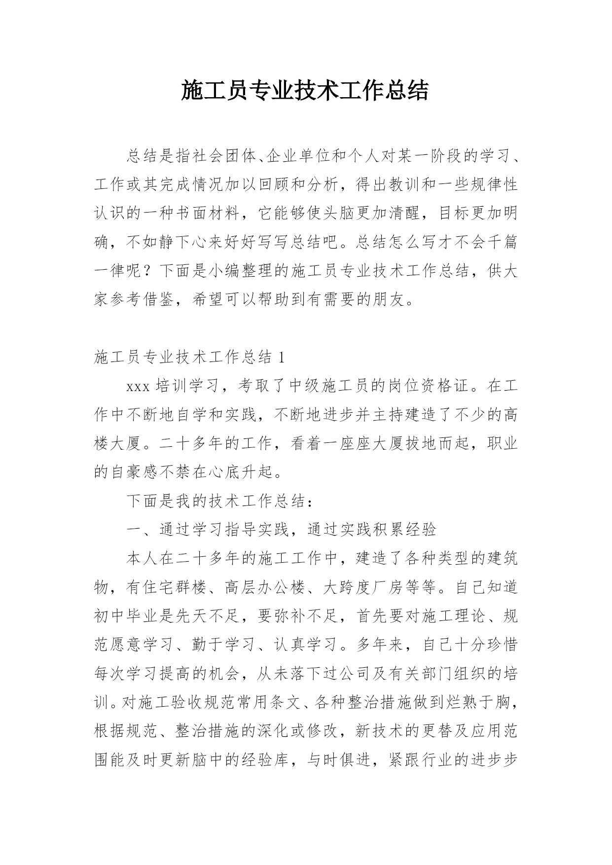 施工员专业技术工作总结总结是指社会团体、企业单位和个人对某一阶段的学习、工作或其完成情况加以回顾和分析,得出教训和一些规律性认识的一种书面材料,它能够使头脑更加清醒,目标更加明确,不如静下心来好好写写总结吧。总结怎么写才不会千篇一律呢?下面是小编整理的施工员专业技术工作总结,供大家参考借鉴,希望可以帮助到有需要的朋友。施工员专业技术工作总结1xxx培训学习,考取了中级施工员的岗位资格证。在工作中不断地自学和实践,不断地进步并主持建造了不少的高楼大厦。二十多年的工作,看着一座座大厦拔地而起,职业的自豪感不禁