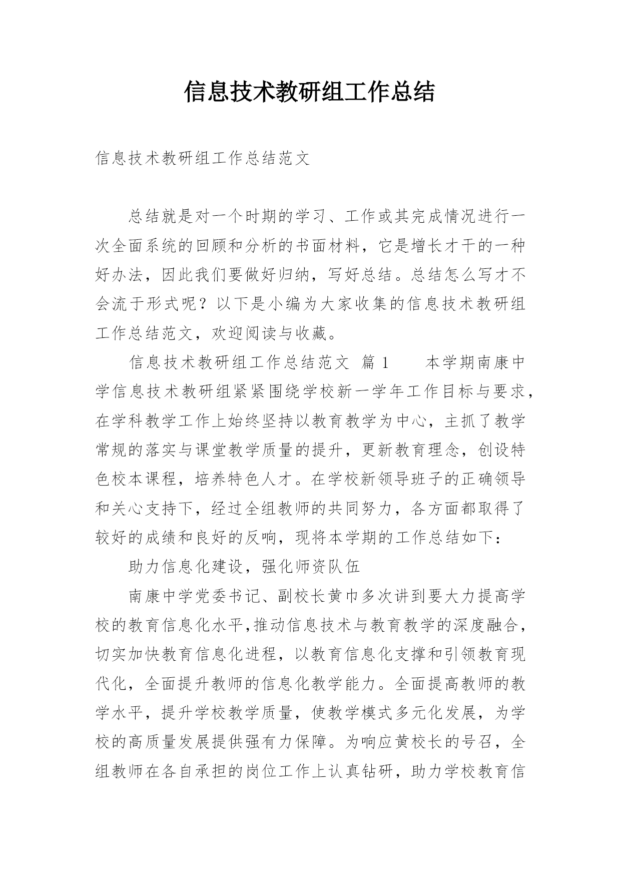 信息技术教研组工作总结信息技术教研组工作总结范文总结就是对一个时期的学习、工作或其完成情况进行一次全面系统的回顾和分析的书面材料,它是增长才干的一种好办法,因此我们要做好归纳,写好总结。总结怎么写才不会流于形式呢?以下是小编为大家收集的信息技术教研组工作总结范文,欢迎阅读与收藏。信息技术教研组工作总结范文篇1本学期南康中学信息技术教研组紧紧围绕学校新一学年工作目标与要求,在学科教学工作上始终坚持以教育教学为中心,主抓了教学常规的落实与课堂教学质量的提升,更新教育理念,创设特色校本课程,培养特色人才。在学校